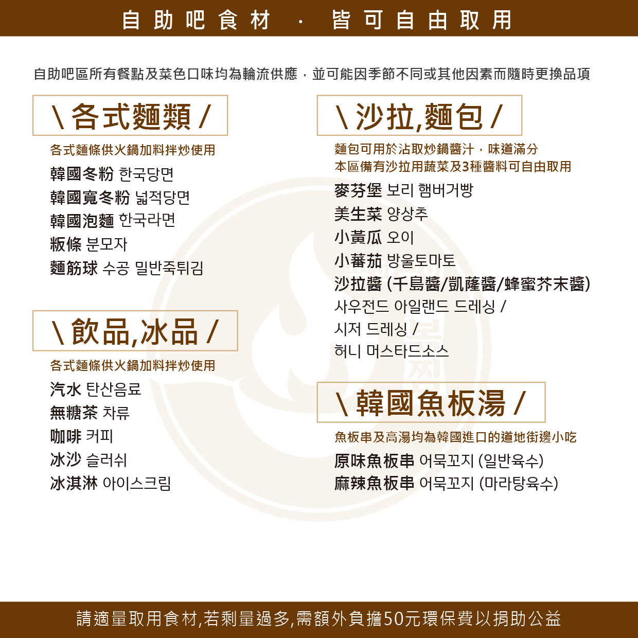 甩鍋雞點餐方式先選鍋口味,有BBQ醬炒雞、蜂蜜醬香雞、經典春川雞、麻舌辣喉雞、狠角色辣雞、辛奇泡菜豬、韓流粉紅豬等等,主鍋可於用餐時間內無限續點,另外自助吧有醬料可以自行調整濃淡