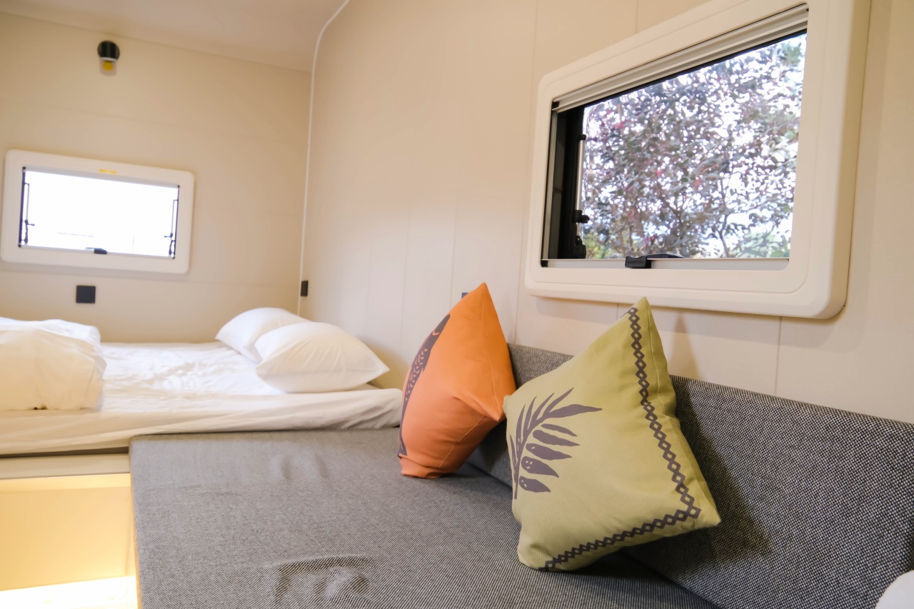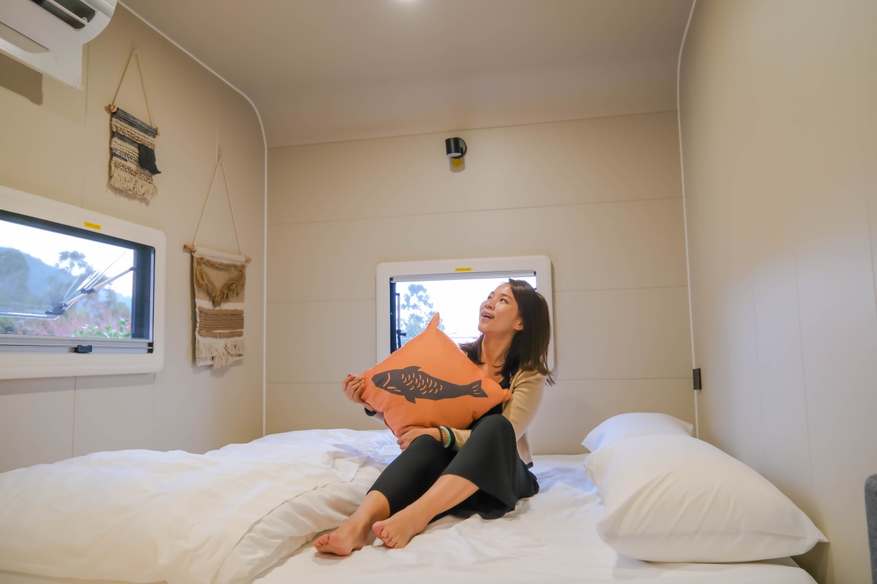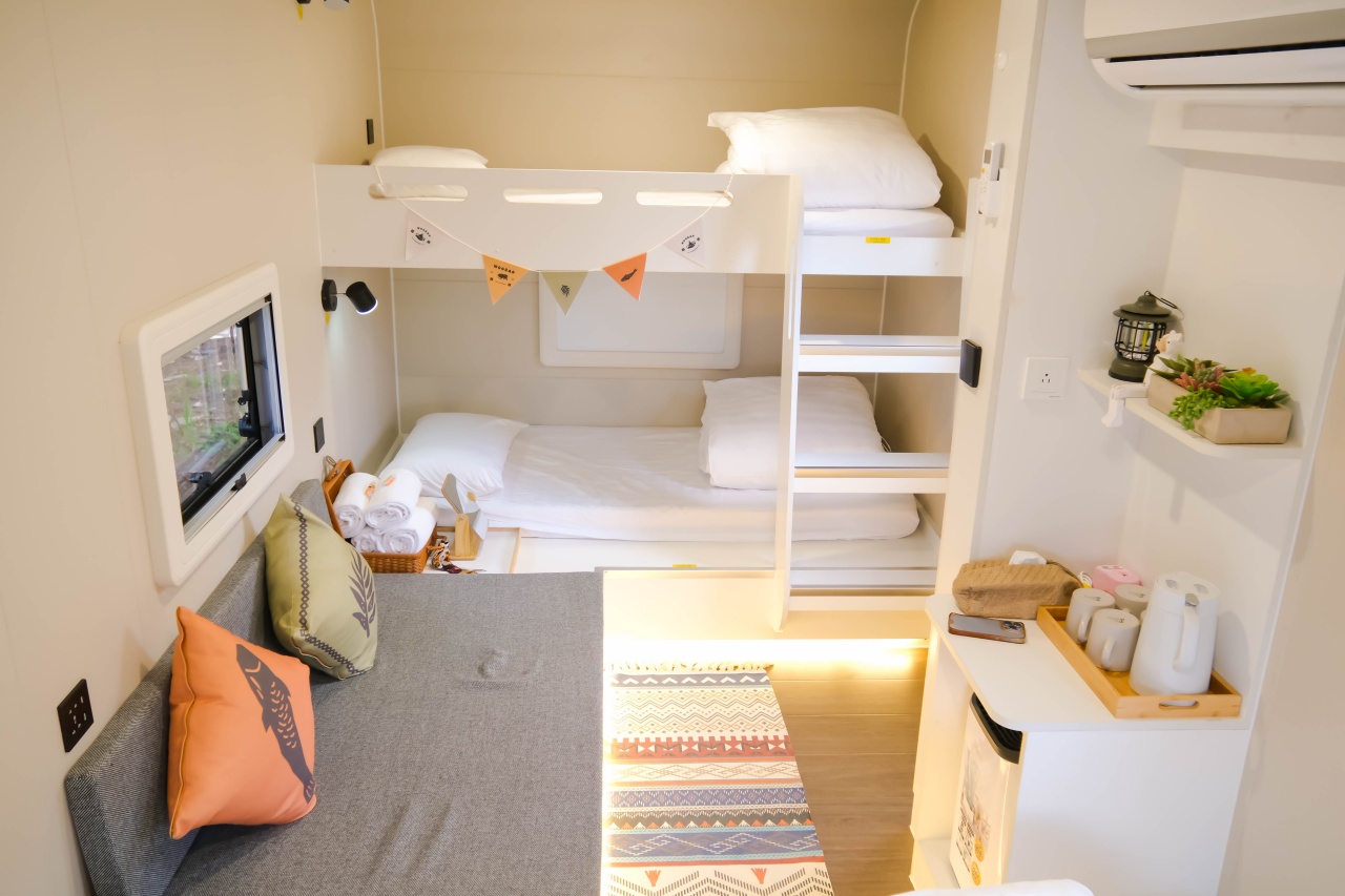 一走進露營車就聞到新車的味道,而且是超級新的那種!車內地板維持的很乾淨,一丁點泥沙灰塵都沒有。都還來不及把行李放進來,就忍不住跳上床,實在太舒服了,而且為了讓空間極大化,設置了上下鋪、雙人床,最多四人入住。