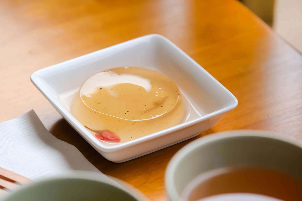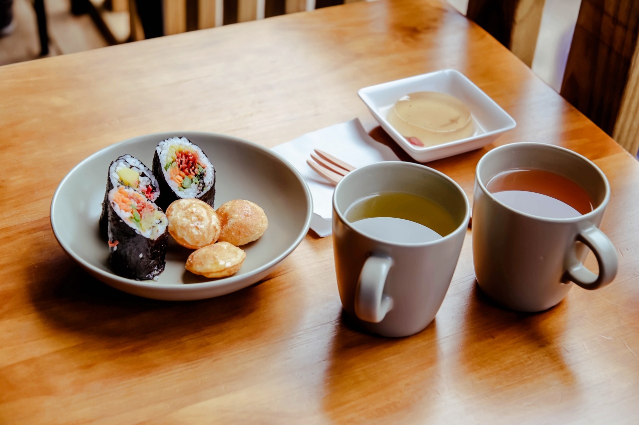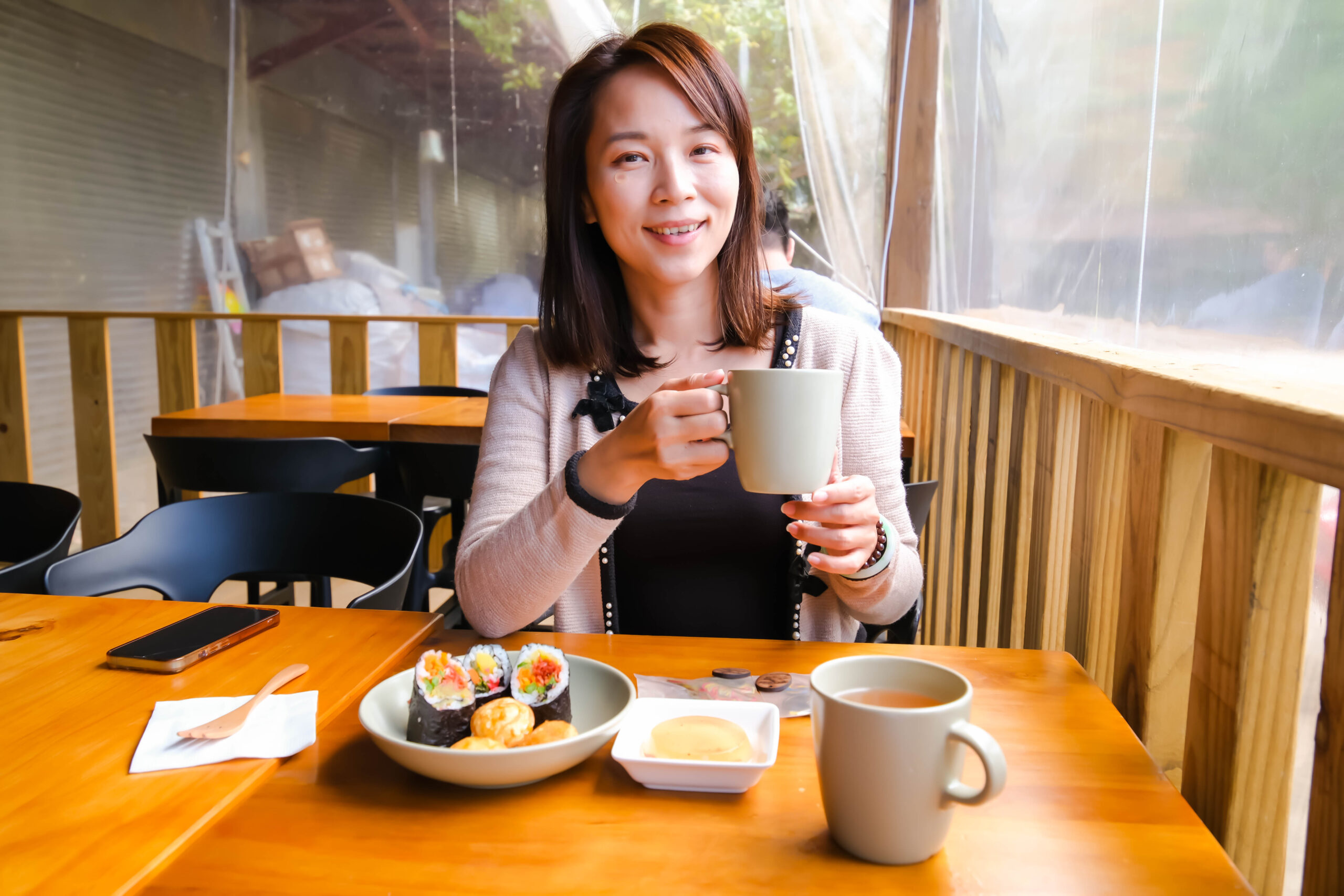 在等待入住前大家都在餐廳區享受迎賓下午茶,會依照季節提供不同的簡單點心,以櫻花入菜的「櫻花馬告凍」、加入泰雅族飲食文化的「泰雅野菜手捲」、荷蘭小鬆餅、飲品,還有免費的鑰匙圈DIY。