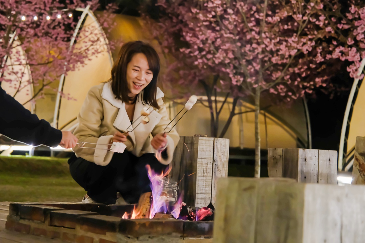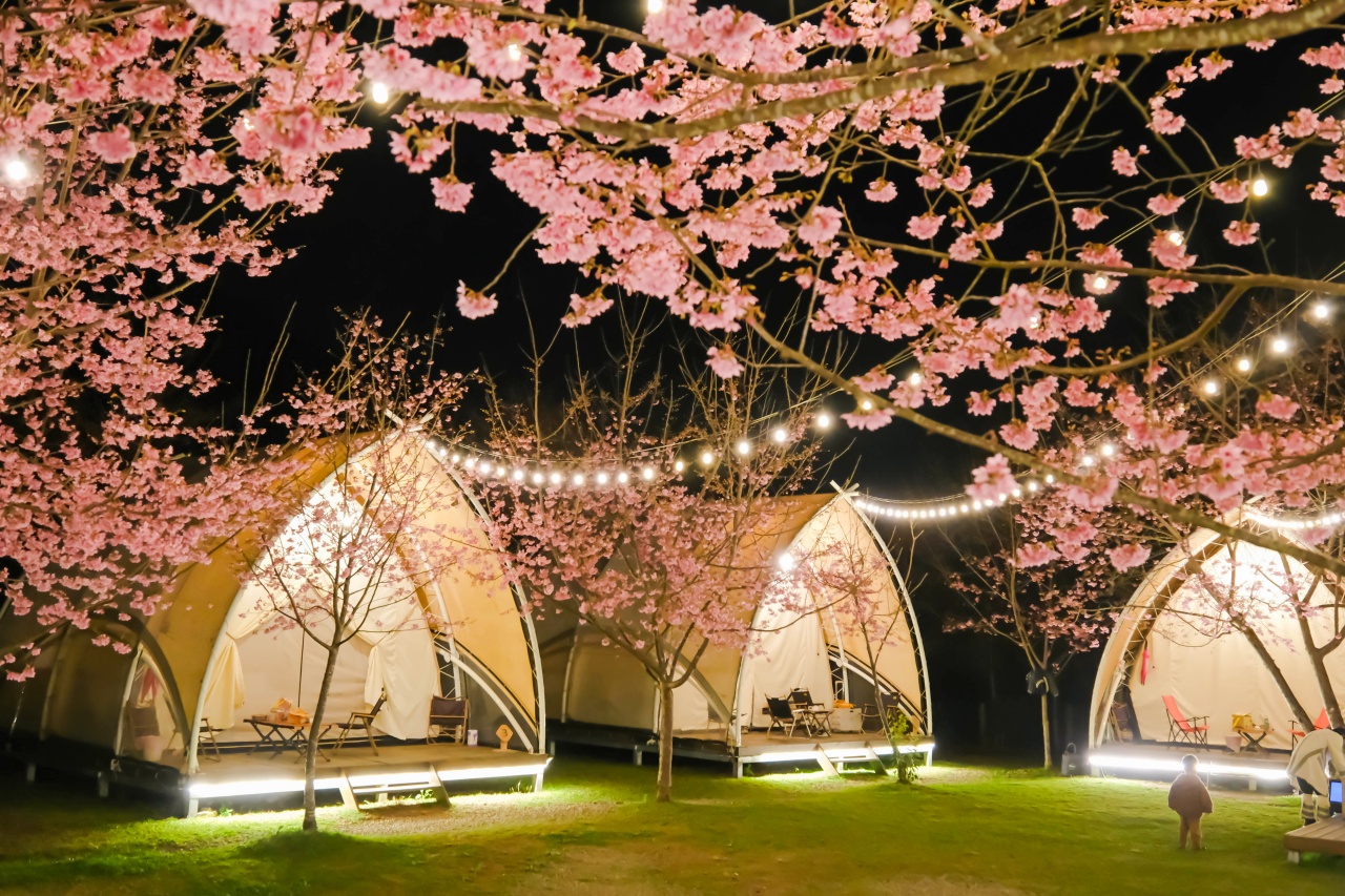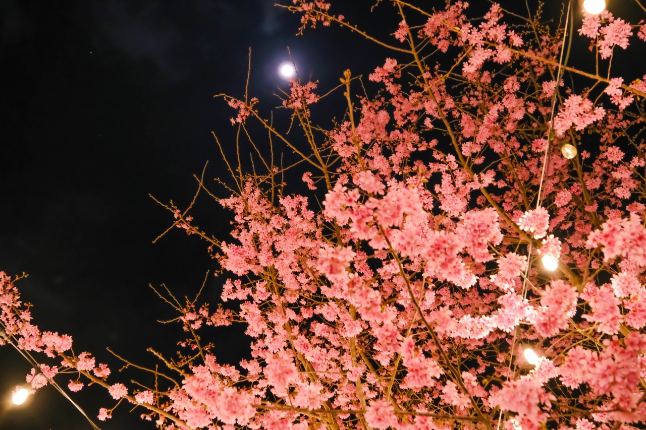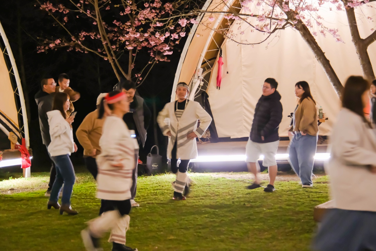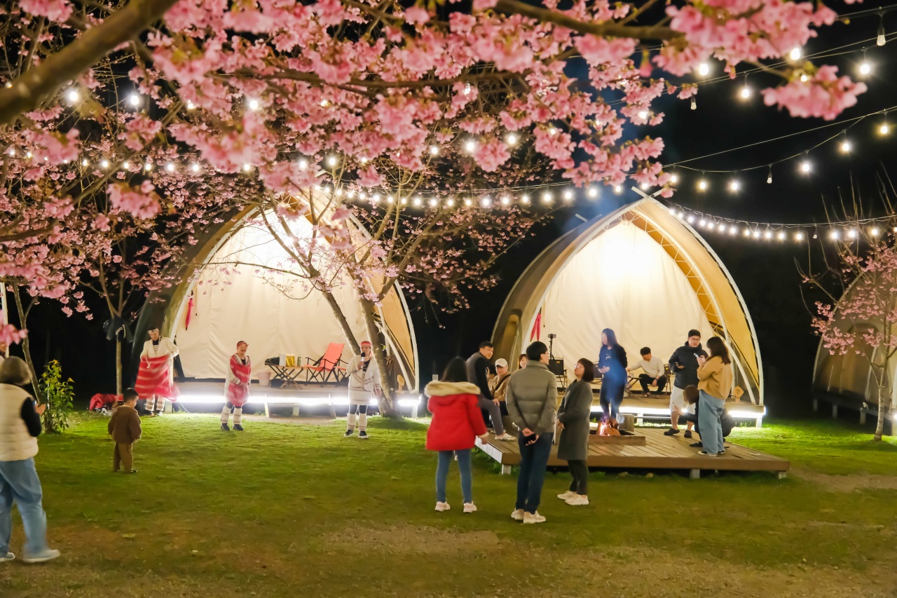 晚餐後夜間活動緊鑼密鼓上場,人潮陸續聚集到豐收地,夜裡的櫻花又是別有一番美景。