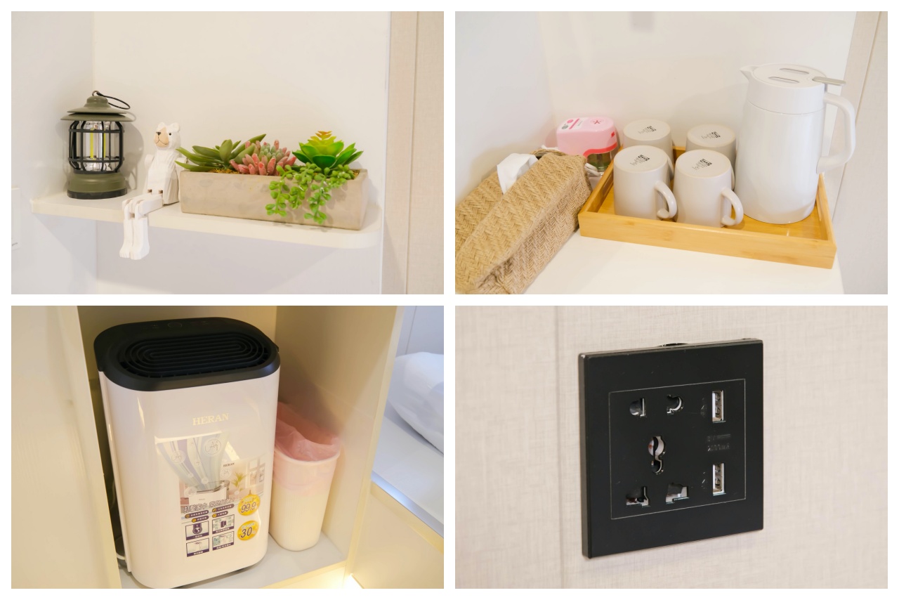 車內提供有空氣清淨機、熱水壺、馬克杯、可愛飾品、USB插座。