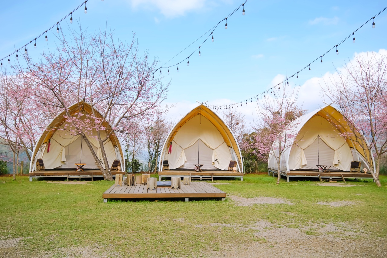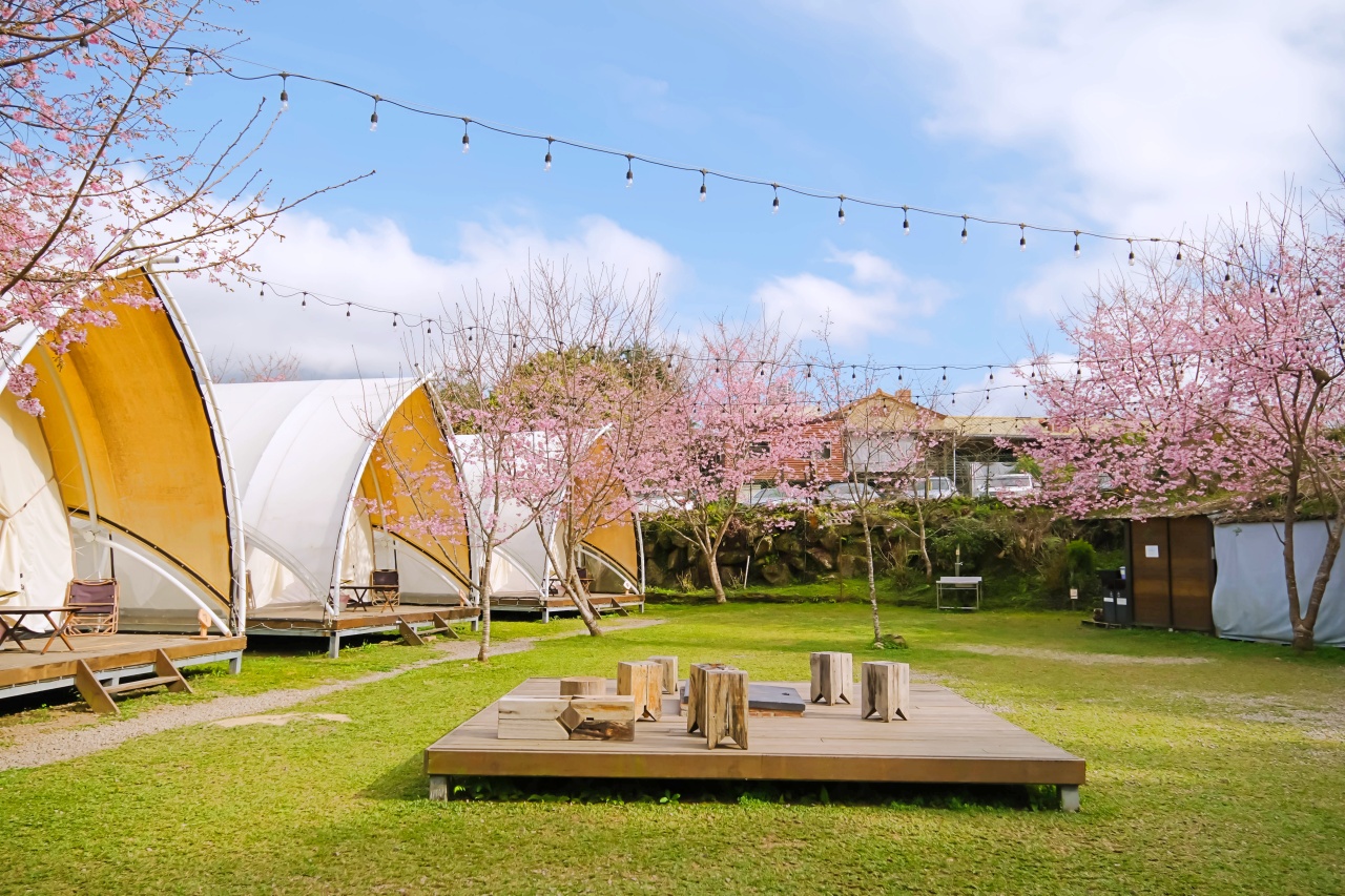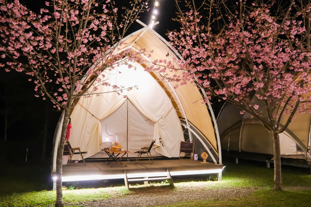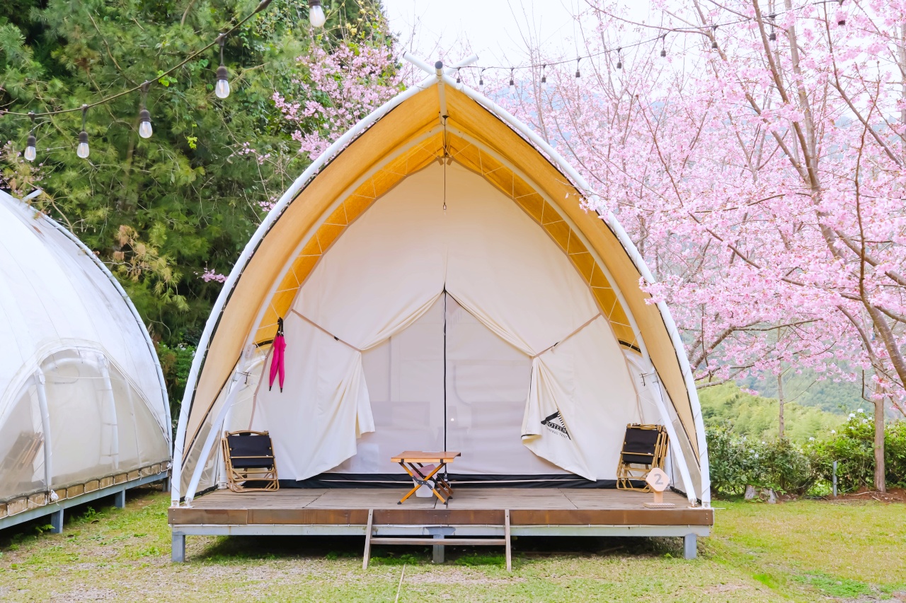 豐收地 (帆船帳): 豬飛最推薦這裡!提供戶外桌椅,可住 2 ~ 5 人,櫻花林最佳位置,有公用衛浴,鄰近餐廳