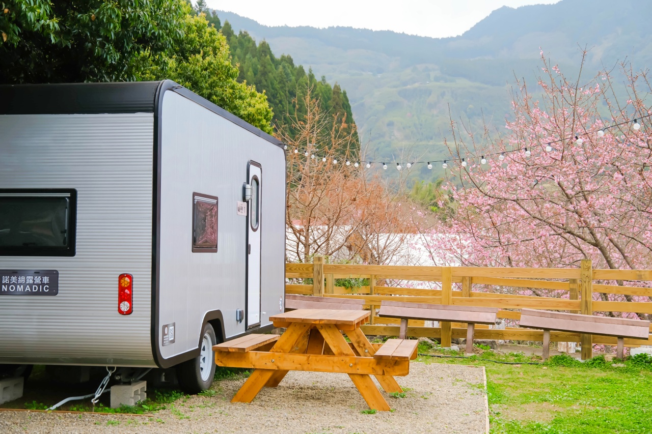 露營車是今年1月底正式推出的住宿,共有3台。漢斯先生一知道有露營車,立馬跟我說他想住,平常找他出門露營都要想很久,倒是這次很主動提出(笑)。雖然沒有櫻花林環繞的風景,卻多了正對山谷的浩瀚感。