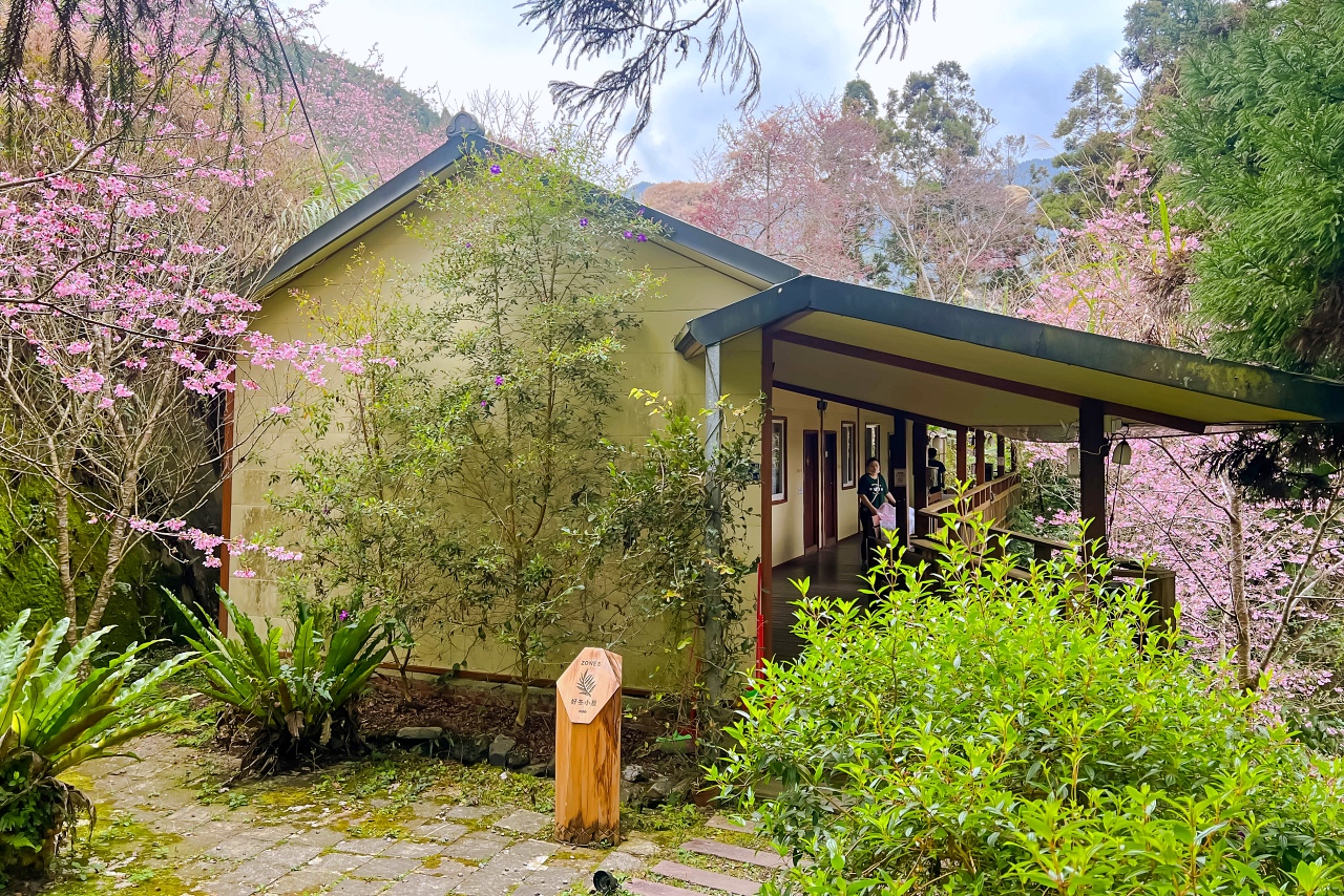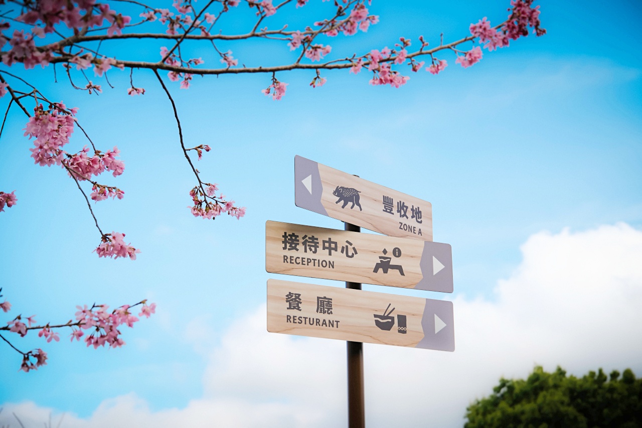 一進入園區大門就是停車場,接待中心跟餐廳就在停車場旁木屋。下午14:00就可以入園了,提供迎賓下午茶、DIY手作,趁著天還亮著在園區裡走走逛逛,拍下櫻花盛開的美景。山區天黑得快,建議不要太晚上山喔。