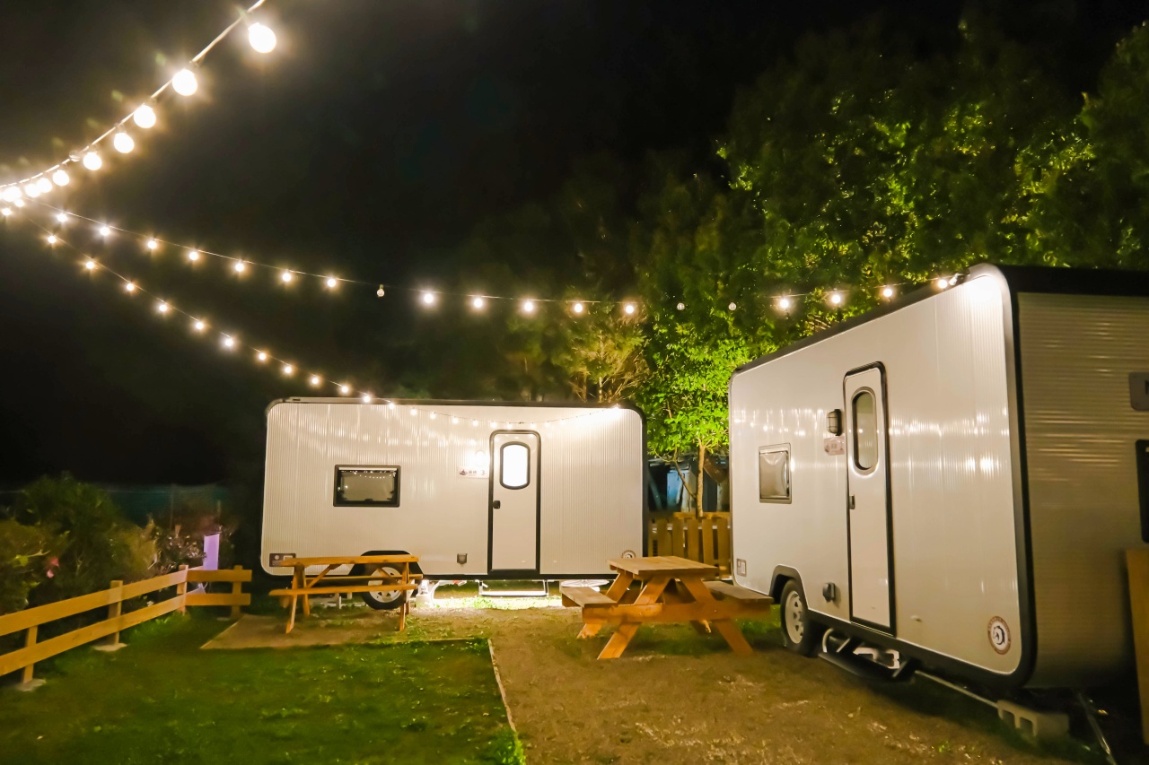 夜晚的露營車在串燈的映襯之下更顯浪漫。