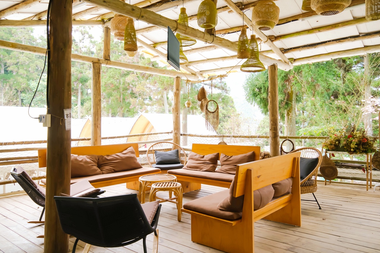 【蟬說:霧繞】跟【蟬說:霧語】都是在五峰鄉山上,兩個營區距離很近,大約15分鐘車程。【蟬說:霧繞】就在海拔1000公尺的泰雅族白蘭部落,所以沿路都可以看到原住民相關圖騰裝飾,園區裡也有不少泰雅圖騰的意象。四周美麗的杉木林,幸運的話還能看見壯麗雲海喔。