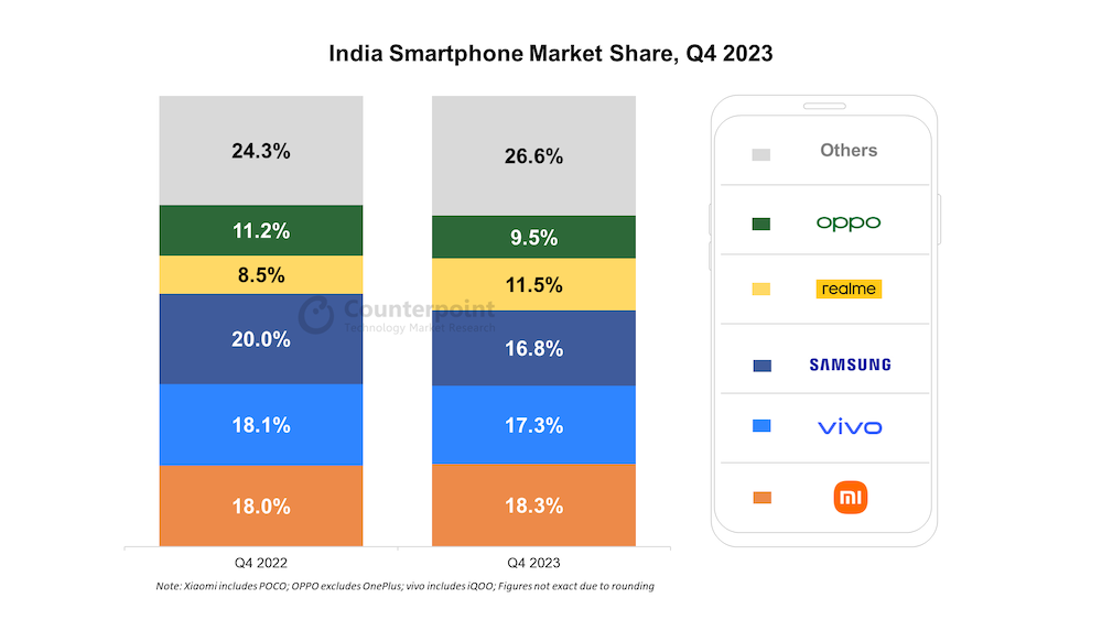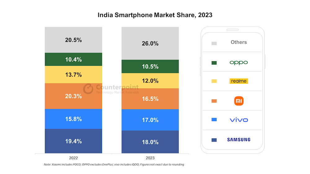 2023 年 印度市場 – 三星衛冕 vivo 緊追