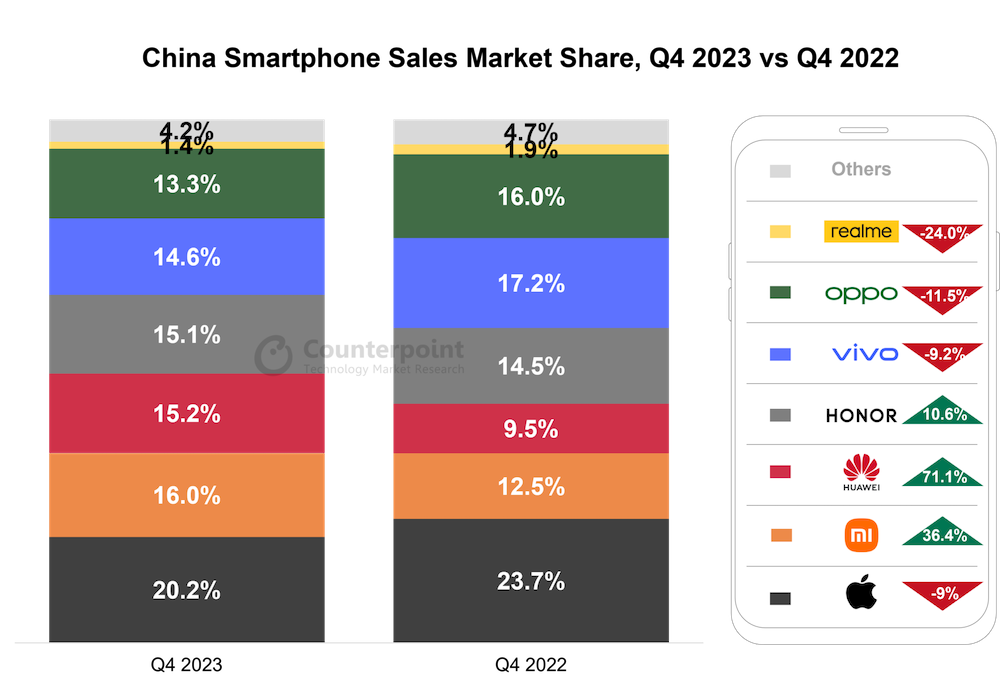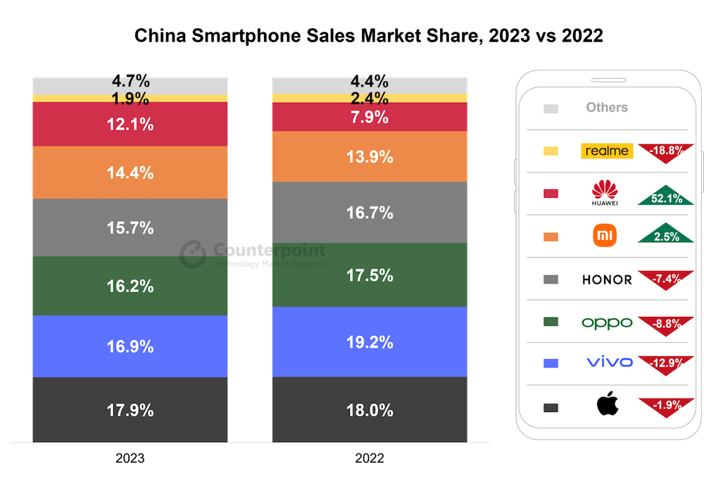 Counterpoint Research 在評論蘋果 2023 年銷售成績時指出,雖然透過美國的幫助以及印度、加勒比海、拉丁美洲、中東與非洲等新興市場的 2 位數成長,讓蘋果首次取代三星成為全球 2023 年出貨量最大的手機品牌,但中國市場的華為與其他手機品牌正在復甦,因此預期會為蘋果在中國手機市場帶來相當多的挑戰。