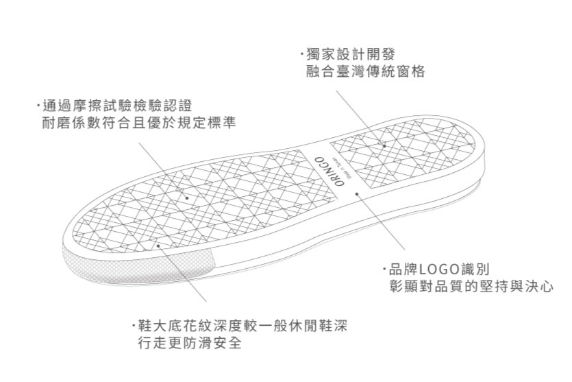 ORINGO 林果良品為提高橡膠大底品牌辨識度,以街道中常見的鐵窗幾何設計,結合全新品牌識別風格,呈現兼具現代與復古美感設計的鞋大底花紋。鞋底三層不同深度的花紋刻度,為全新設計的橡膠大底LibreSole,提供絕佳的排水及防滑功能。
