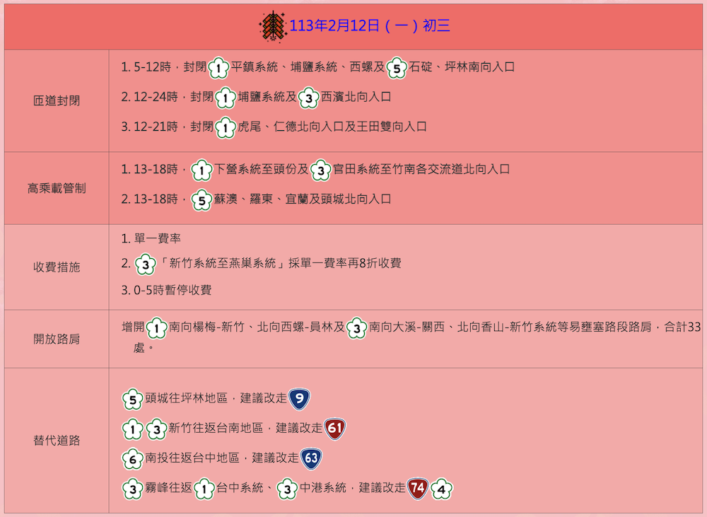 113 年春節連假國道匝道封閉、高乘載管制、收費措施與開放路肩 一覽