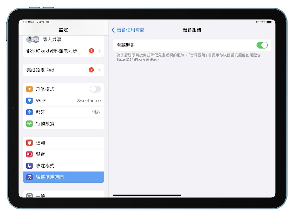 iPadOS 17 也加入了「螢幕距離」功能,能讓孩子在使用的時候保持適當的距離,降低兒童近視的風險。