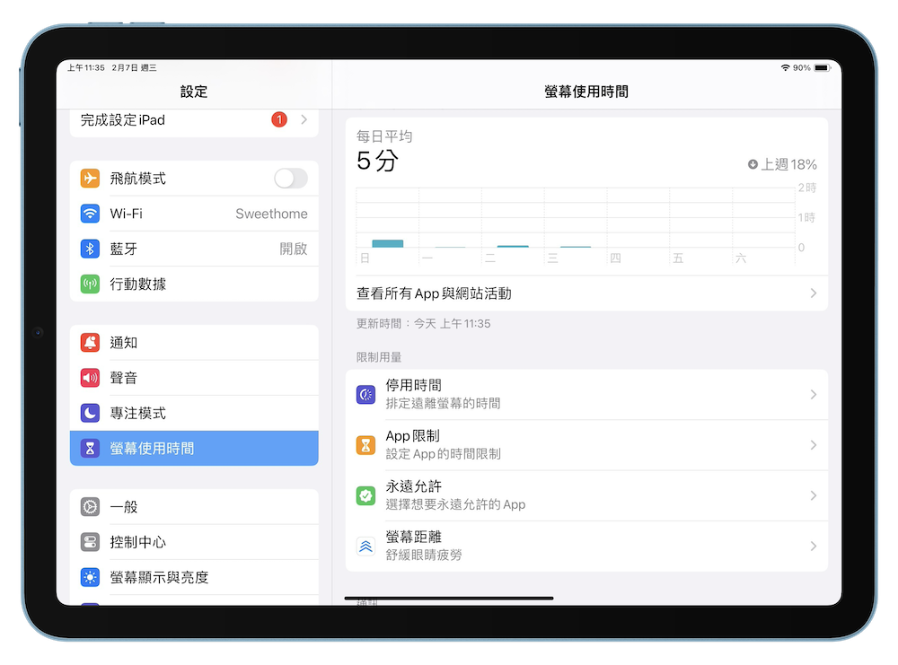 「螢幕使用時間」可讓家長們知道你和孩子花了多少時間在 App、網站等內容上。這樣一來,你就可以在掌握更多資訊的情況下,決定要如何更安全的使用裝置,並視需要來做設定限制。