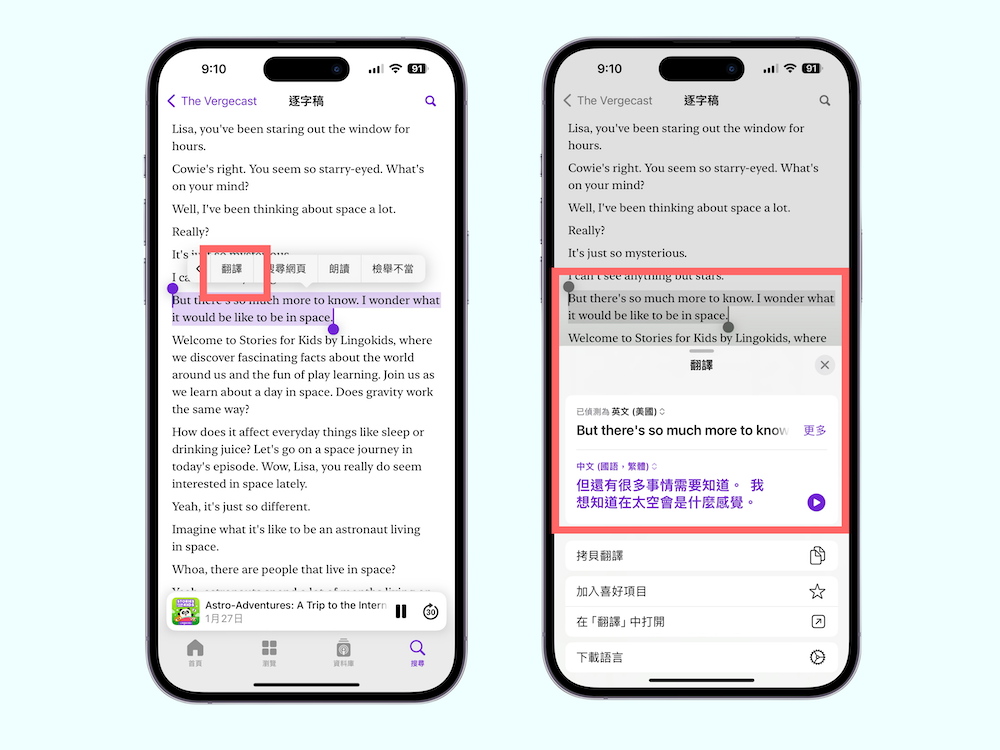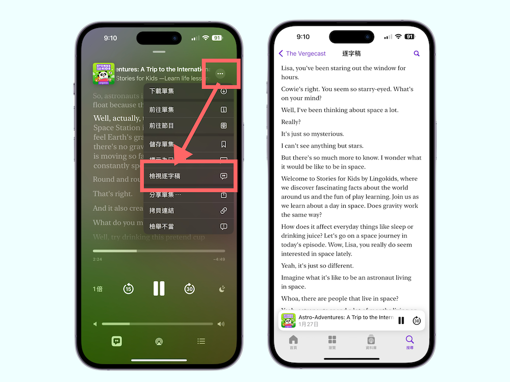 原來我們在逐字稿的右上方「…」可以選擇「檢視逐字稿」,這樣剛剛的 Podcast 內容就會躍然於紙上,這時候我們就能從剛剛的聽力,變成練習閱讀能力了。