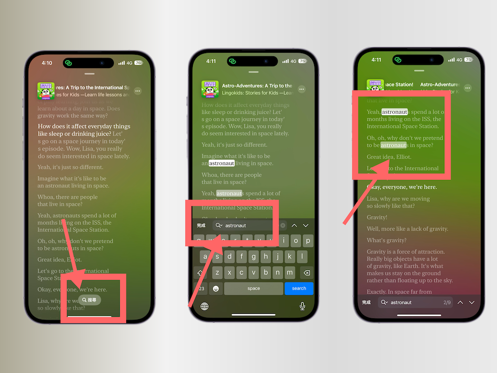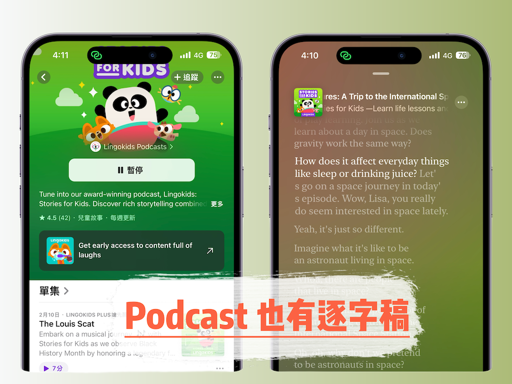 目前 Podcast 逐字稿功能可以支援英文、德文、西班牙文,如果想要讓自己好好練習聽力的朋友不妨可以試試唷!