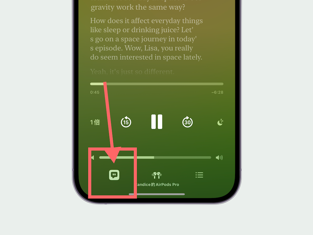 把 iOS 17 更新到 iOS17.4 後開啟 Podcast。就能在左下方看到眼熟的「字幕」圖示,只要點下去就能開啟逐字稿的功能。