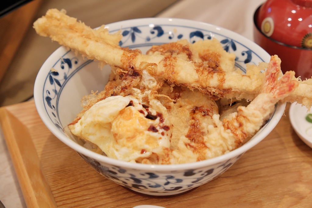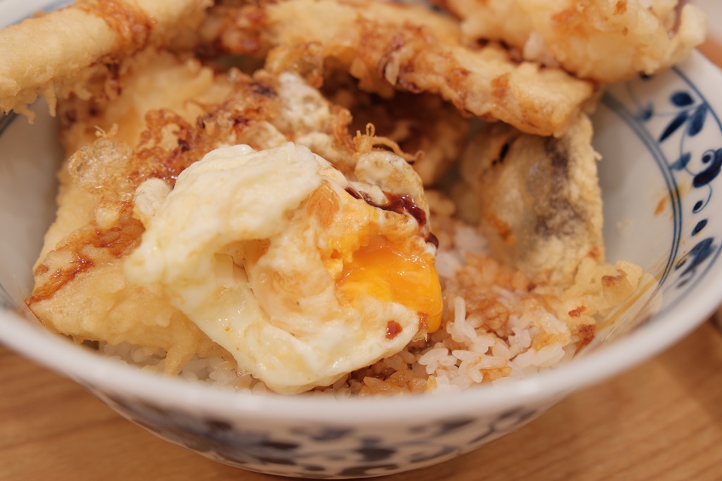 包含星鰻、草蝦、花枝、雞蛋、野菜三品,全場焦點肯定是那根長長的星鰻!現點現炸、薄脆的麵衣吃起來完全不會油膩,一口咬下就能吃到細緻的魚肉,草蝦和花枝也都很新鮮,野菜三品有香菇、杏鮑菇和地瓜,雞蛋則是炸半熟蛋,一劃開濃郁的蛋汁流出來,和飯拌在一起超加分,整體表現很有水準~