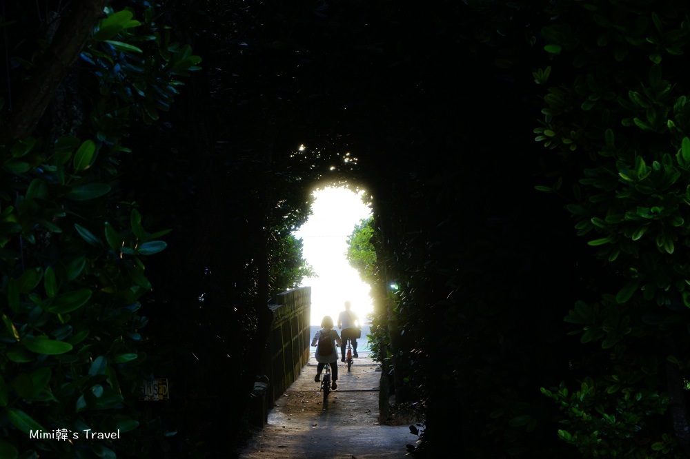 而我覺得這個被取名「伊江島的眺望」的景色相當特別,騎著單車穿過一段林木隧道直達海邊,景色豁然開朗,而且在隧道中就能正對著看到伊江島。
