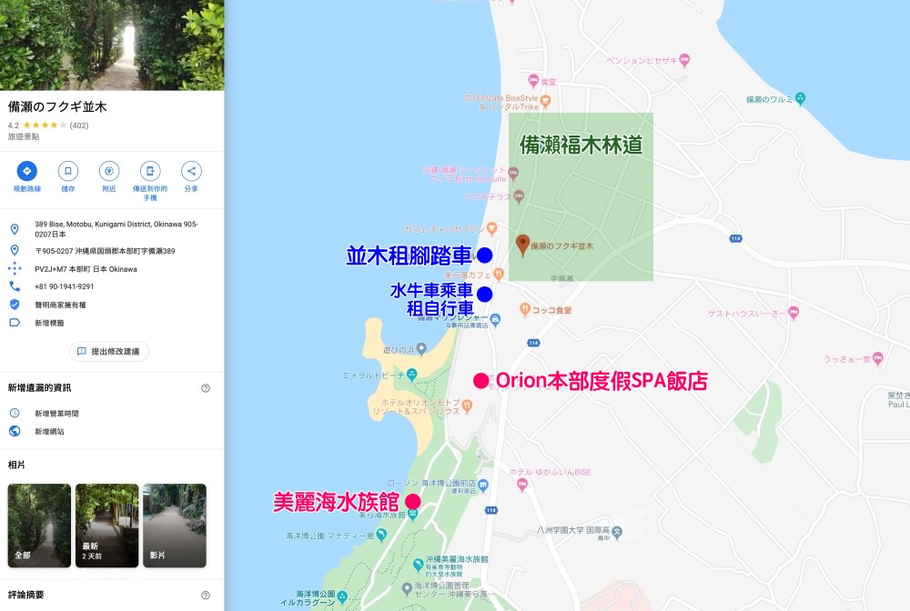而我們這次就住在沖繩水族館旁邊的Orion本部度假SPA飯店(查房價),所以直接把車停在飯店,走路就能到備瀨福木林道去玩也是相當方便。飯店有景觀好沙灘也非常漂亮,是很沖繩北部很值得推薦的海景住宿飯店。