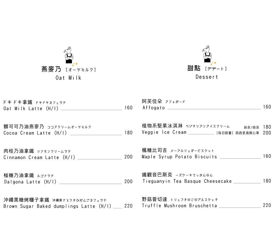 店內全部飲品餐點都是無蛋奶製作,提供手沖單品、咖啡、茶、燕麥奶飲品、甜點等,喝的品項很多,可惜餐點種類比較少,期待之後會有更多選擇!