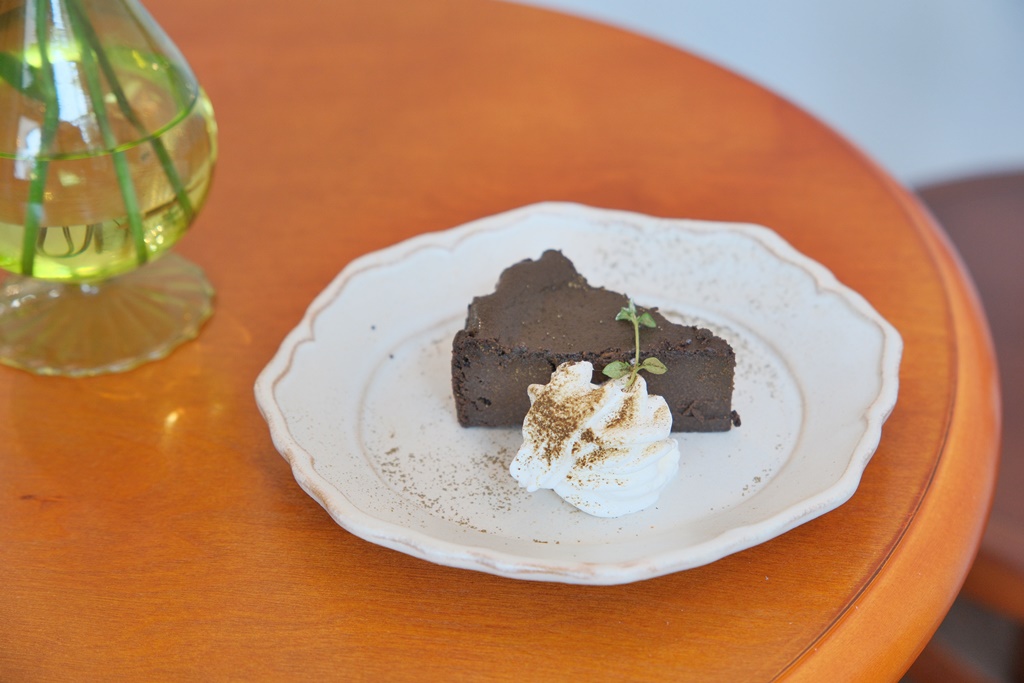 以豆腐和堅果製成,和一般常見的蛋糕口感較為不同,起初會稍微吃不習慣,但多吃幾口會發現蠻耐吃的,比較不甜膩,茶香也很足夠~期待未來會有更多餐點可以選擇
