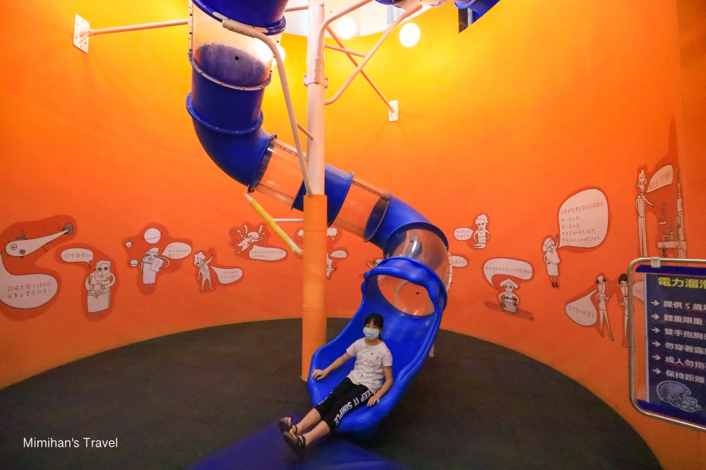特別的是台電南部展示館這座兩層樓高的「電力溜滑梯」是模擬核能反應爐製作,橘色的弧形牆代表著爐內水蒸氣,藍色的溜滑梯則是爐內循環的冷卻水,而小朋友們化作水分子從滑梯溜下來,體驗著冷卻水在爐內冷熱交換的過程,但當然啦!這實在沒辦法跟孩子解釋,就是放任他們玩耍。