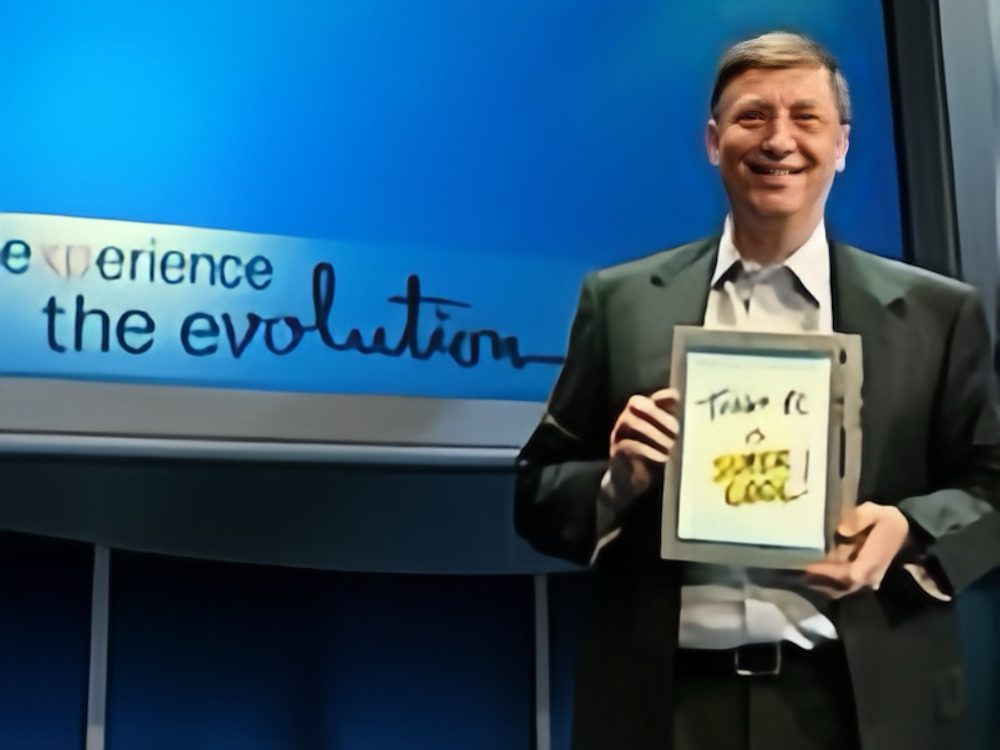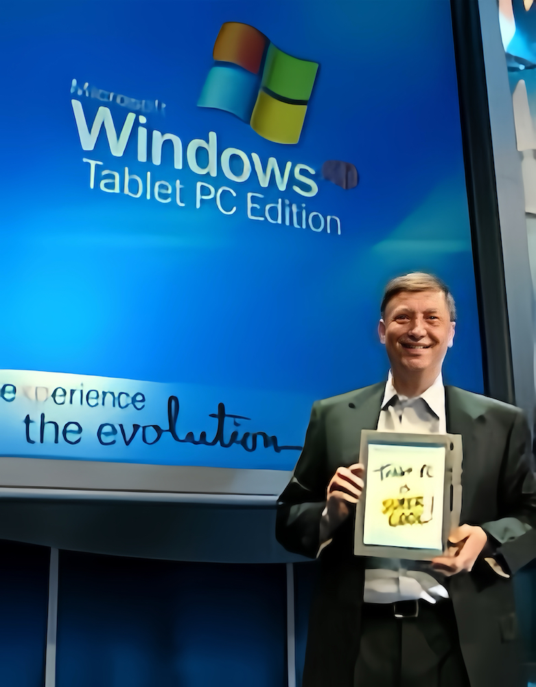 不過微軟在 2000 年時,比爾蓋茲於美國拉斯維加斯的電腦展(Comdex Fall 2000)進行演講,在演講中首次由微軟的軟體架構師伯特·基利(Bert Keely)為大家帶來重量不到 3 磅(1.36 公斤) ,體積小到可以用一隻手拿著的平板電腦,最棒的就是還為大家展示如何用觸控筆來在螢幕上塗鴉、書寫,並且把內容存成電子檔,甚至還可以寫電子郵件、在文件上做筆記,然後跟跟文件一起傳送出去或是分類存成檔案,日後想要修改,就只要打開文件,透過鍵盤來重新輸入資料。