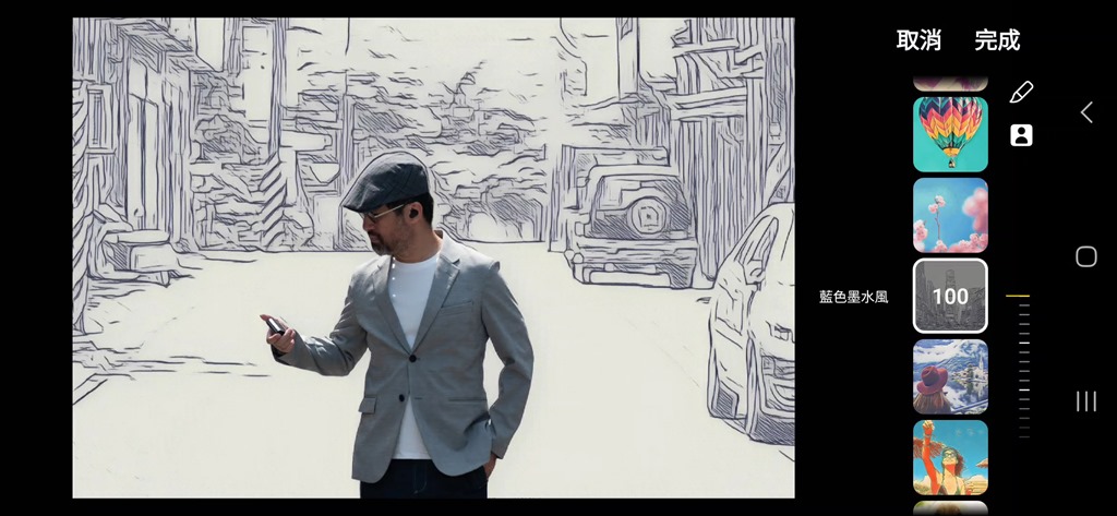 裡面有 10 個風格,每個風格都還能調整程度,但這不是重點,重點是現在可以把人與背景分開,只要點選人的小圖示,就可以將人像以原圖呈現,再點一次就會切換到背景真實、人物加上風格,這樣就可以完成一張特別的照片。