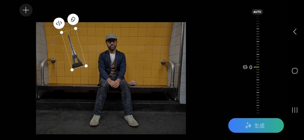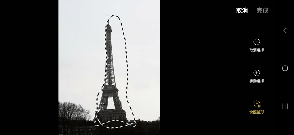 移動與移除物件功能,也是 S24 AI 重要功能之一,在系統更新後,近期似乎有更好的效果。方式很簡單,直接在照片中點選要移除的物件,圈選完畢後,再次點選框起來的物體按下橡皮擦,就可以直接移除並補上其他元素。這幾次測試後,效果得更自然。