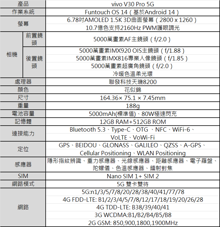 vivo V30系列即日起於全台各大通路開賣,建議售價如下: