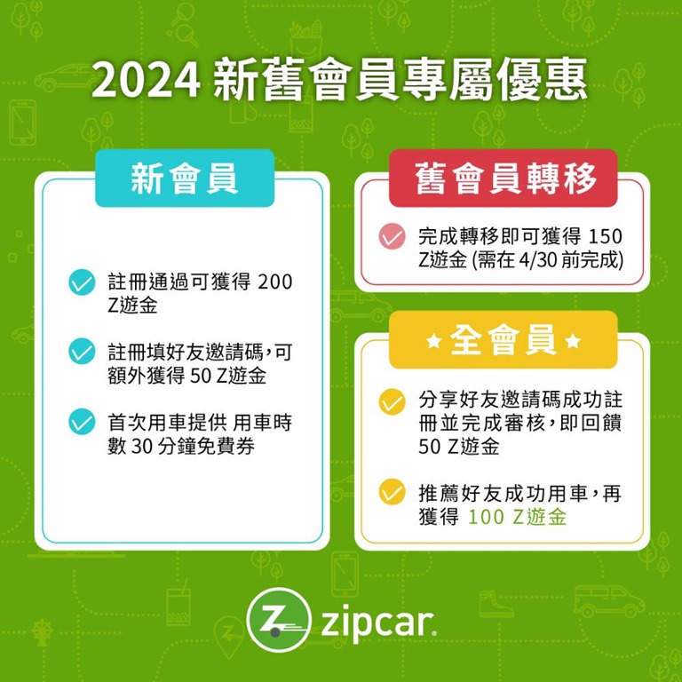 為歡慶 Zipcar 全新改版上線,活動期間 (2024/3/8~4/30) ,舊會員於新系統更新資料即贈送 Z 遊金 150 元;而全新加入的朋友,註冊成功即可獲得 Z 遊金 200 元及首次用車 30 分鐘體驗券,邀請好友成功加入 Zipcar,可再獲得額外優惠。