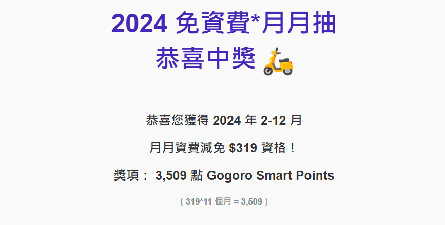 此封領獎信於 3/20 下午 3 點左右陸續傳送到消費者手中,除了信件標題以領獎通知提醒外,內文中還詳述中獎內容。內容表示得到 2024 年 2~12 月,月月資費減免 319 員資格,獎項為 3509 點 Gogoro Smart Points。