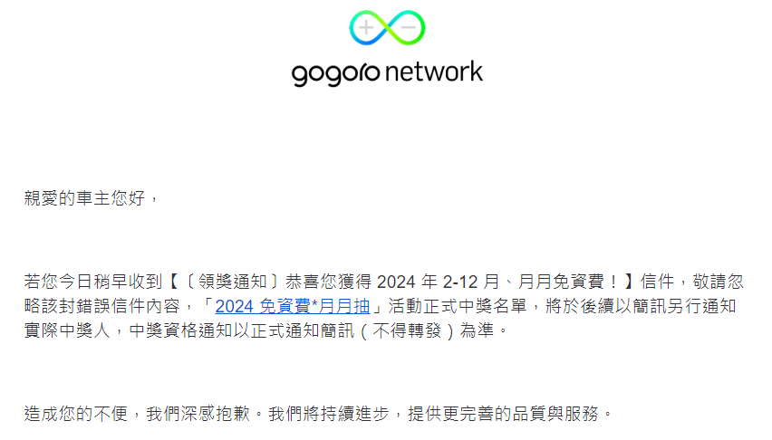 在 3/20 下午,在 Gogoro 宣布獲得 “《Fast Company》全球前 50 大最具創新力公司” 後,非常多 Gogoro 車友都收到 “【領獎通知】恭喜您獲得 2024 年 2 – 12 月、月月免資費!” 信件,許多朋友都開心的以為自己得到了大獎,也有不少網友以為這是詐騙郵件。約莫在事發後四小時,Gogoro 緊急通知該信件為錯誤內容,讓許多朋友白高興一場。