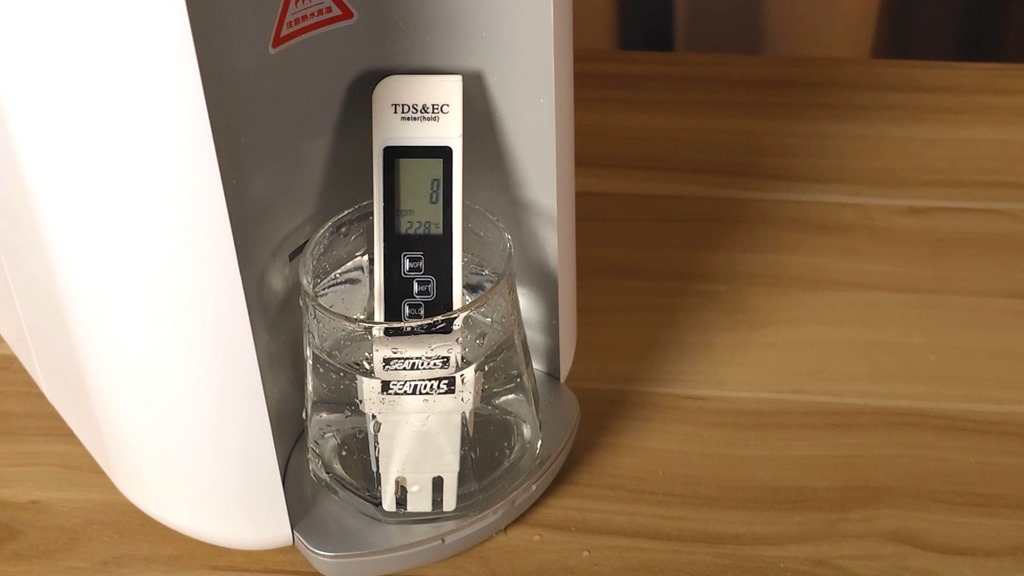 我們使用 TDS 水質檢測筆來測試 Honeywell 太空人 RO 濾淨瞬熱飲水機的過濾效果,TDS 的意思是 Total dissolved Solids,也就是每公升水中含有多少毫克的溶解性雜質,TDS 越高代表水裡的雜質含量越高,比較不適合人體飲用,一般都市處理過的自來水通常會落在 80 至 300ppm 之間。