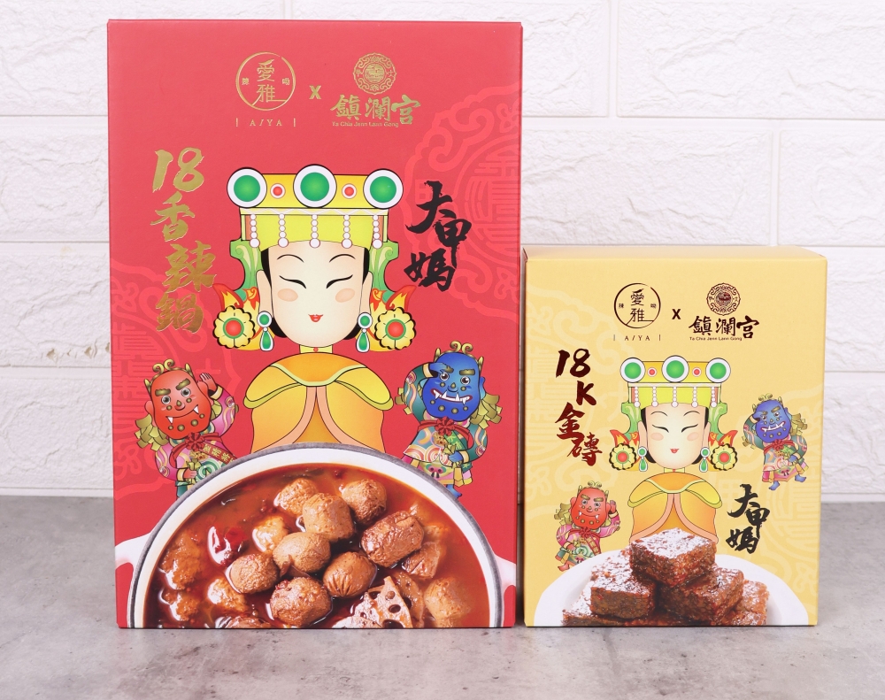大甲媽祖遶境進香是台灣最重要的民俗活動之一,近年來更被聯合國教科文組織認列為「世界非物質文化遺產」,每年都吸引上萬名信眾參與年度盛事、祈求媽祖保佑,愛雅辣呦首次與鎮瀾宮大甲媽祖聯名,推出專屬設計款包裝的「18香辣鍋」與「18K金磚」等商品,將於3/26官網正式開賣,限量兩萬盒,愛好者屆時可要手刀快搶。