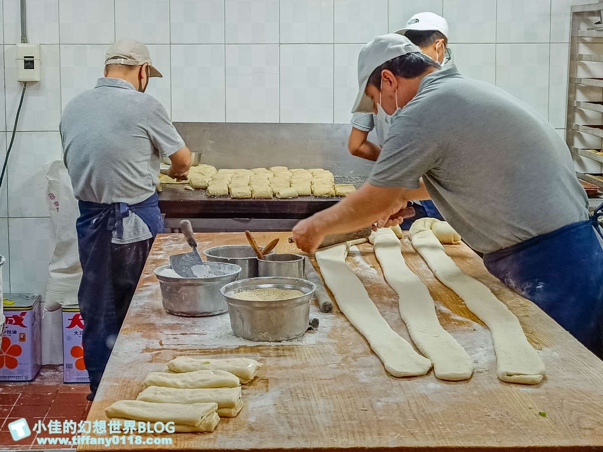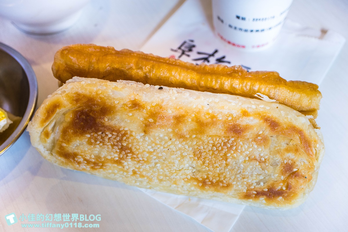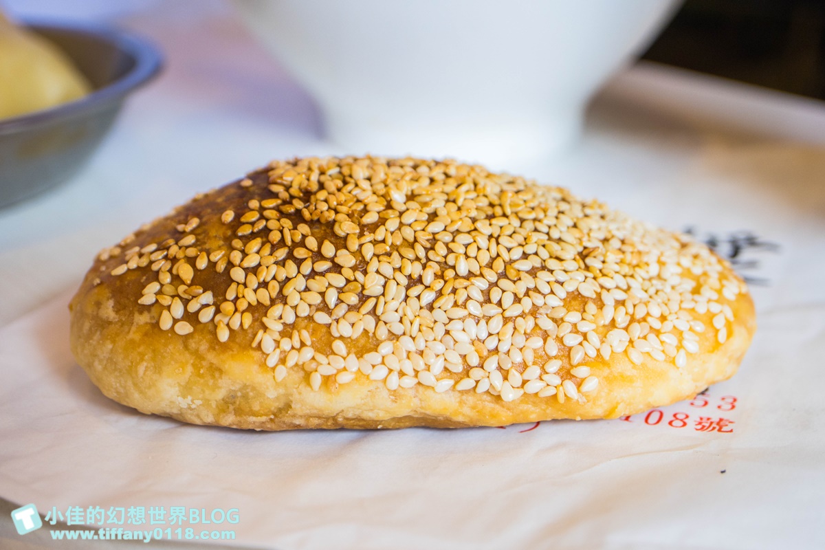 ▼來到阜杭豆漿一定要吃吃看他們家的招牌–厚燒餅聽說是用老麵發酵15個小時以上,跟一般早餐店賣的燒餅完全不一樣,阜杭豆漿的厚燒餅是最能吃到老麵那種越咀嚼越香甜的味道。厚燒餅人如其名,從側面看真的很厚實,最上面抹上糖水再撒上芝麻,經過特殊的烤爐一片片這樣烤出來的,從頭到尾完全手工製作。