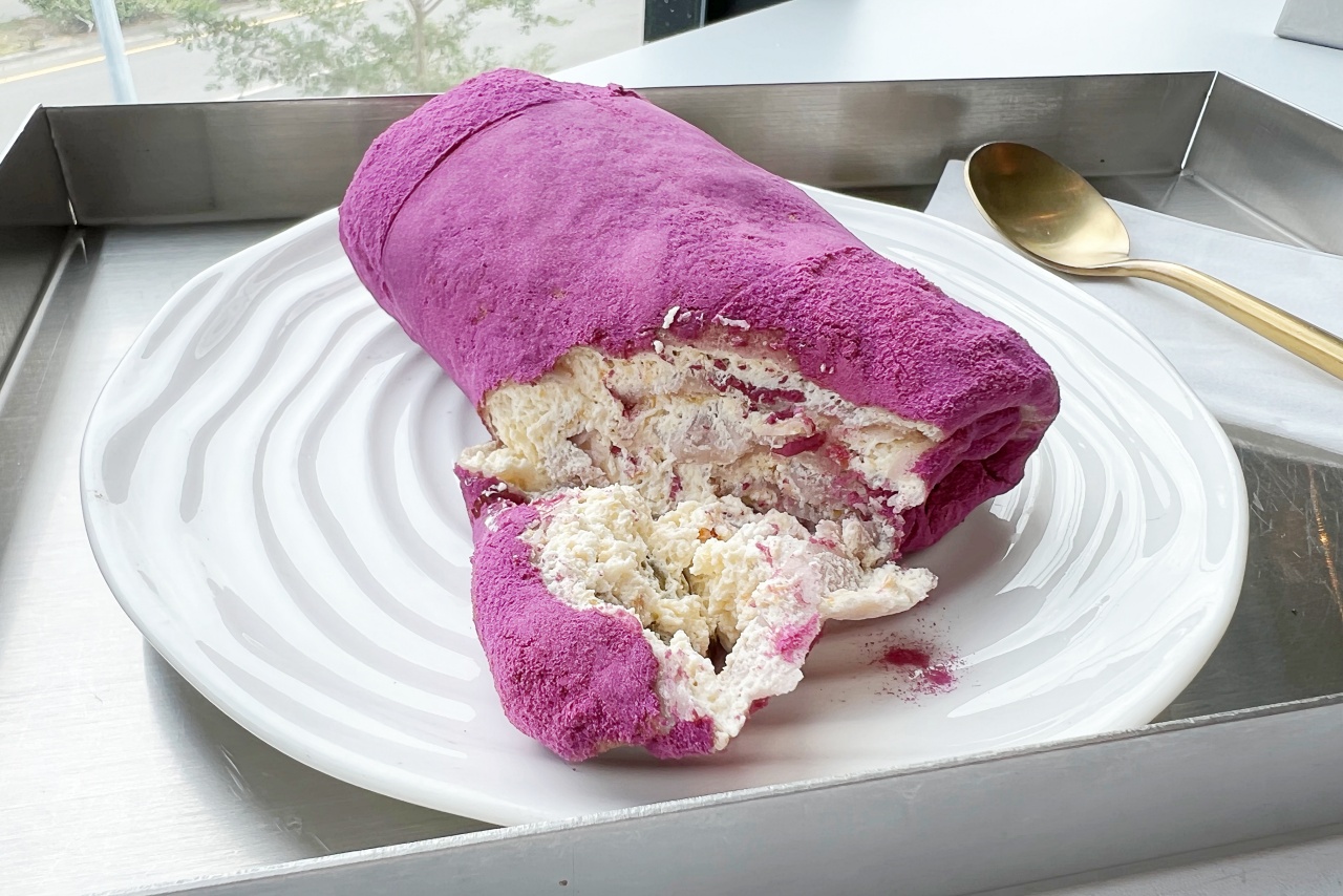 紫薯栗子地瓜口味的毛巾捲,外觀顏值很高,顏色是浪滿的薰衣草紫,我好捨不得破壞它呀。奶油跟地瓜搭配一起甜度我覺得很剛好,吃得到地瓜香氣與纖維。這個口味豬飛超推!