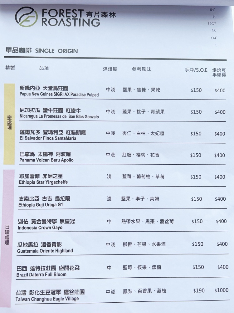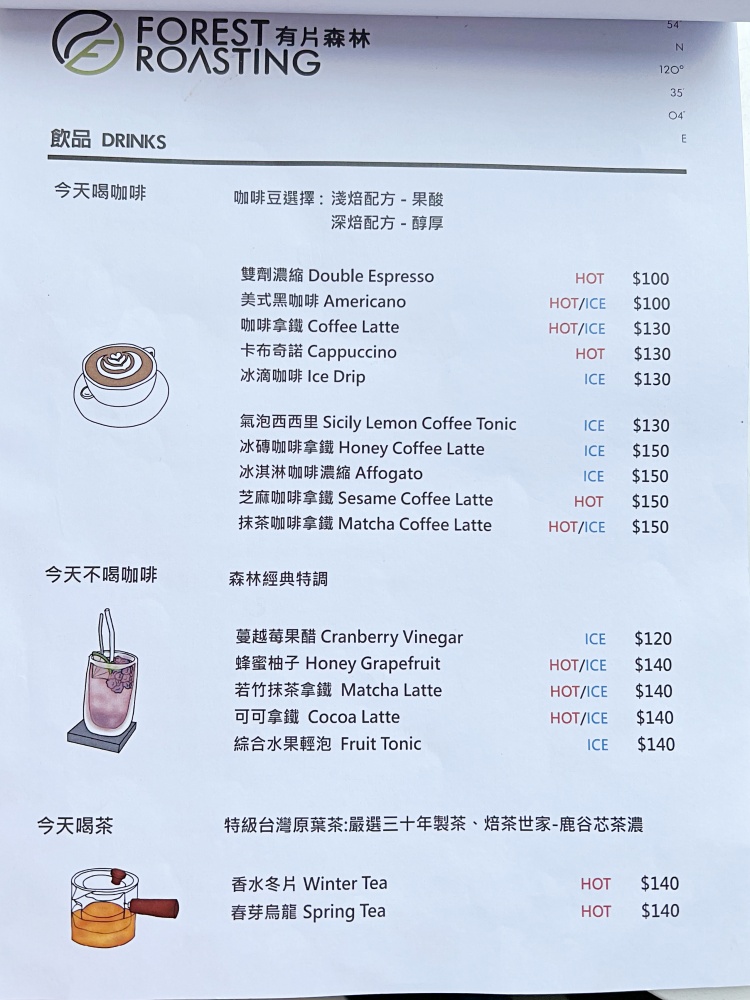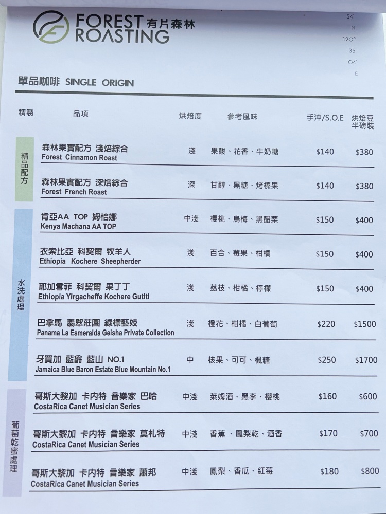 精品咖啡的部分有淺、中、深的焙度與水洗、蜜處理、日曬的方式,菜單上也清楚的寫明風味,可以依照喜愛挑選,如果很難下決定,就交給店家推薦吧。單品咖啡上桌會有熱的、冰的兩種喝法,滋味大不同喔。我選的這支是「森林果實 淺焙」 帶有果酸、花香、牛奶糖風味。