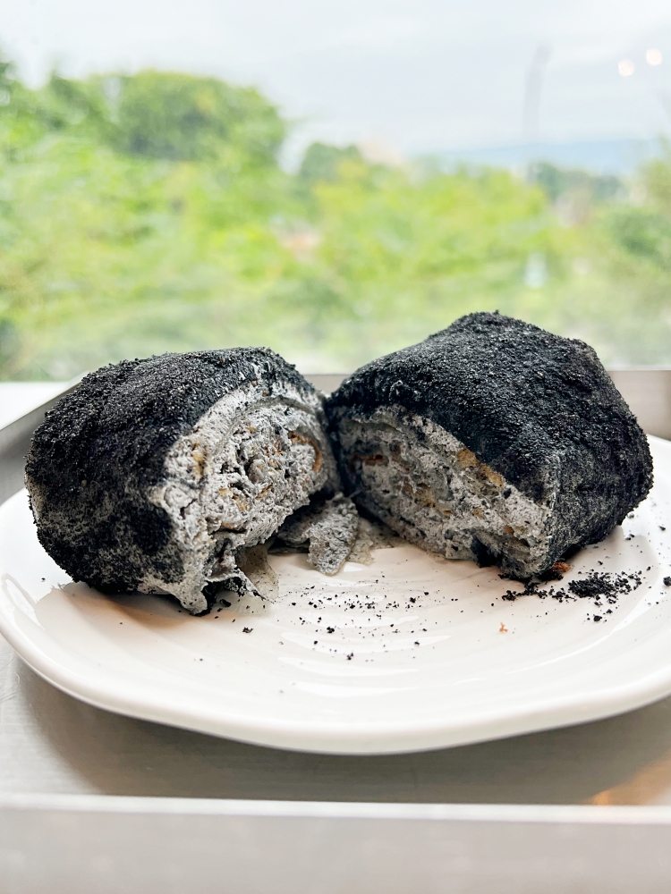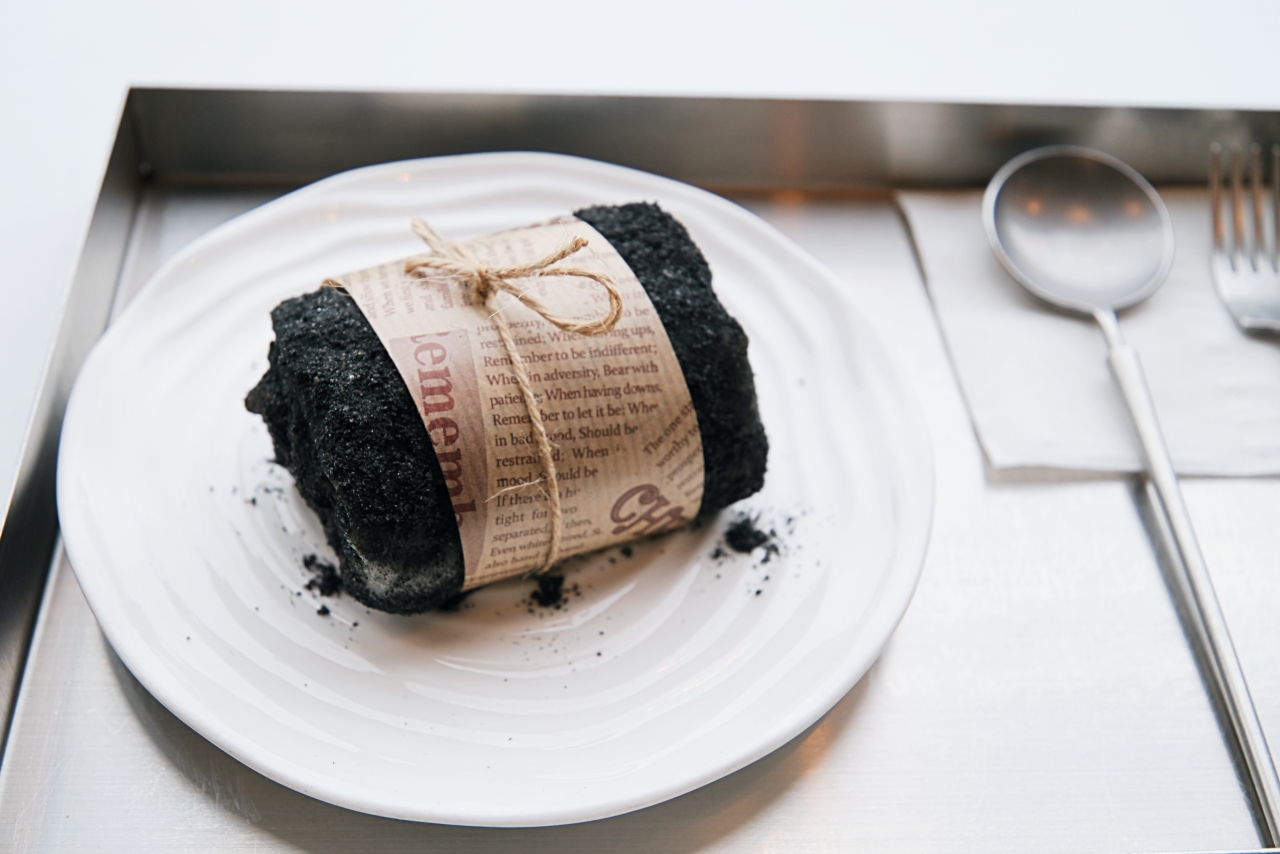 毛巾捲是【有片森林】最有特色的招牌甜點,外觀有夠可愛的蛋糕捲,看起來就像是擬真毛巾,上面撒滿黑芝麻粉,視覺上會好似毛巾絨毛般。切下去飽滿的奶油餡實在太邪惡了,看得出來店家毫不手軟的給滿滿餡料。柔軟的法式餅皮類似千層蛋糕,柔軟濕潤,芝麻奶油餡配上花生顆粒,甜度高一些,適合兩人吃一份比較不會膩。