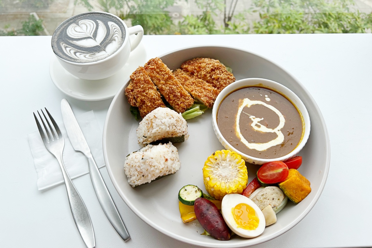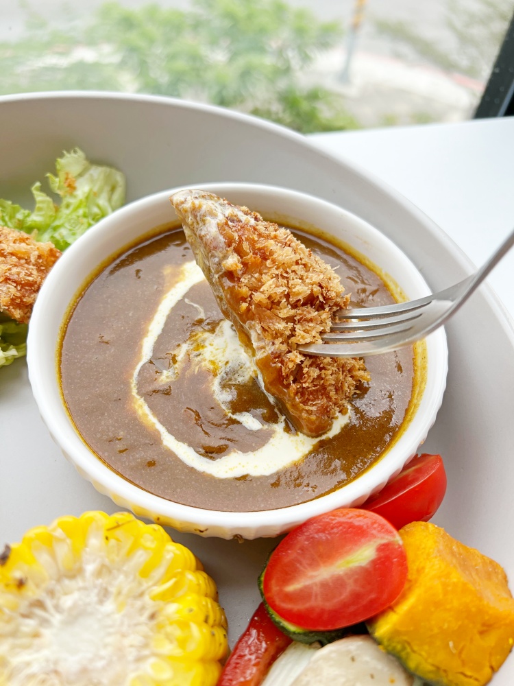 擺盤可愛充滿日系風格的咖哩豬排,好適合拍照呀!用鰹魚香鬆三角飯糰搭配濃郁的熟成咖哩,再擺上川燙時蔬、溏心蛋,配色繽紛令人胃口大開了!炸豬排外酥脆內扎實,沾著深咖啡色的咖哩醬汁,讓炸豬排風味更上一層樓。