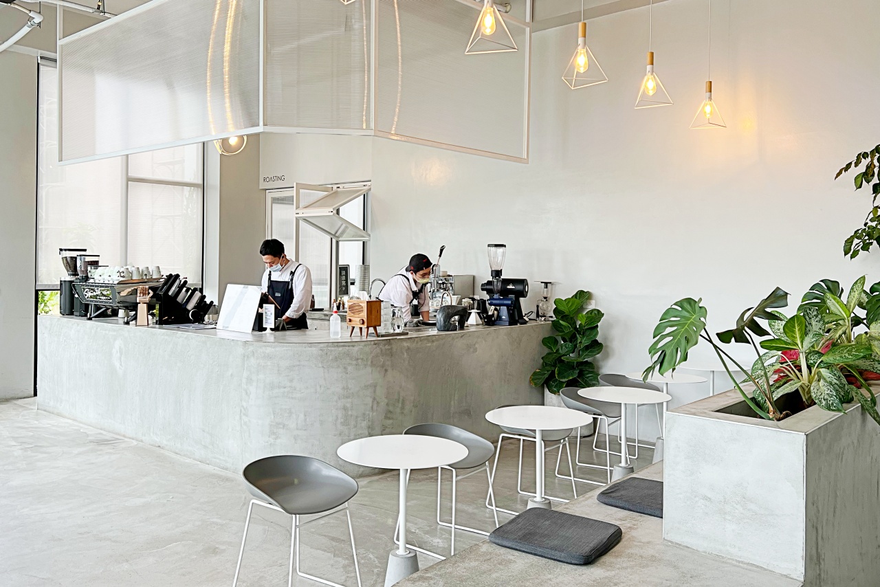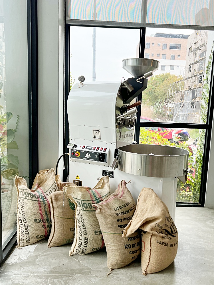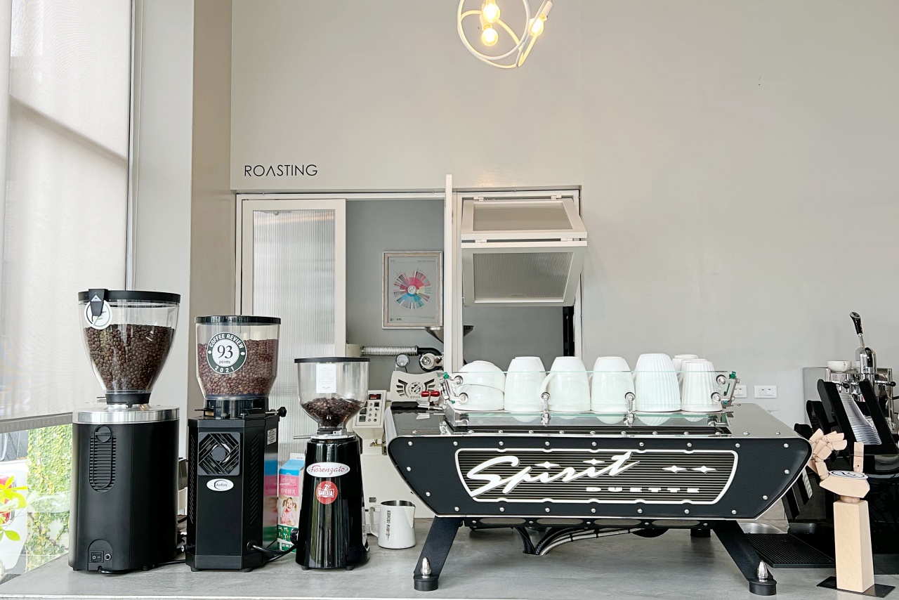 一樓座位比較少,約10個座位,就位在吧台側邊的一字型水泥座位區。吧台前方擺放了烘豆機,這裡提供多種精品咖啡。