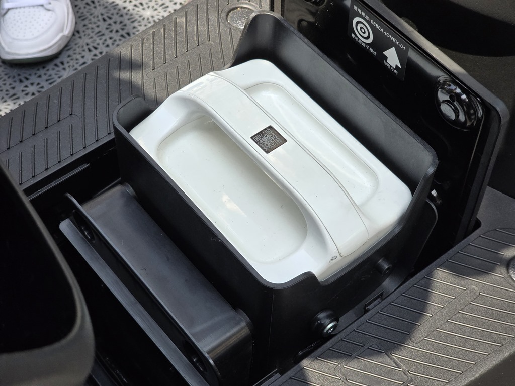 Many 馬卡龍與 Many EV 最大的不同其實有兩點,第一點當然就是採用 Ionex 3.0 的電池,電池位於腳踏板下,只要按一下右邊把手上的按鈕,就可開啟電池匣。當換好電池後,再按一下就可蓋上。不得不說,放在腳踏板上的電池位置,相對於放在車廂內要方便許多。放在車廂內在取換電池時,會稍微較難施力,因為要先將電池抽離車廂的高度較高,所以只能單純靠手的力量。但在腳踏板時,就可以利用核心的力量幫忙,會更省力。