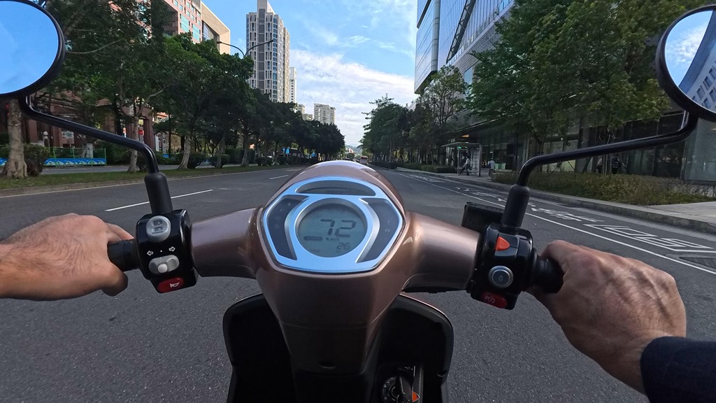 第二個差異就在馬達,原本 Many EV 是 4KW 動力的側掛馬達,其實也算滿足夠,但這次換上了 4.2KW 動力的側掛馬達,與 i-One、i-One Fly 這兩款車相同。實際在道路上騎乘時,在起步加速上,也相當敏捷迅速,加速到時速 40km/h 後,加速才開始放緩,非常符合市區騎乘。在 ECO 模式下,測到最高錶速約有 66km/h 左右,切換到 Power 模式後,測到最高時速大約在 77km/h。另外,在停車場陡坡騎乘也非常夠力,不用催到底就可以輕鬆騎上去。加速感受與 i-One Fly 非常類似,畢竟兩款車都是採用同一個馬達,但單電池的設計在行駛里程較短,以一般騎乘來說,大約會落在 40km 左右,比較適合做為日常接送小朋友,或是短程通勤使用。