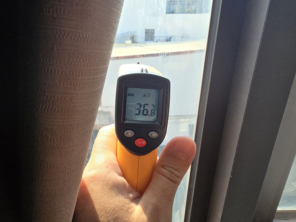 但沒想到牆壁溫度卻只有 29 度、窗戶玻璃也只有 36.8 度,這才發現一開始安裝的窗簾可能因為材質的關係,不只不隔熱,根本就是蒐集熱!