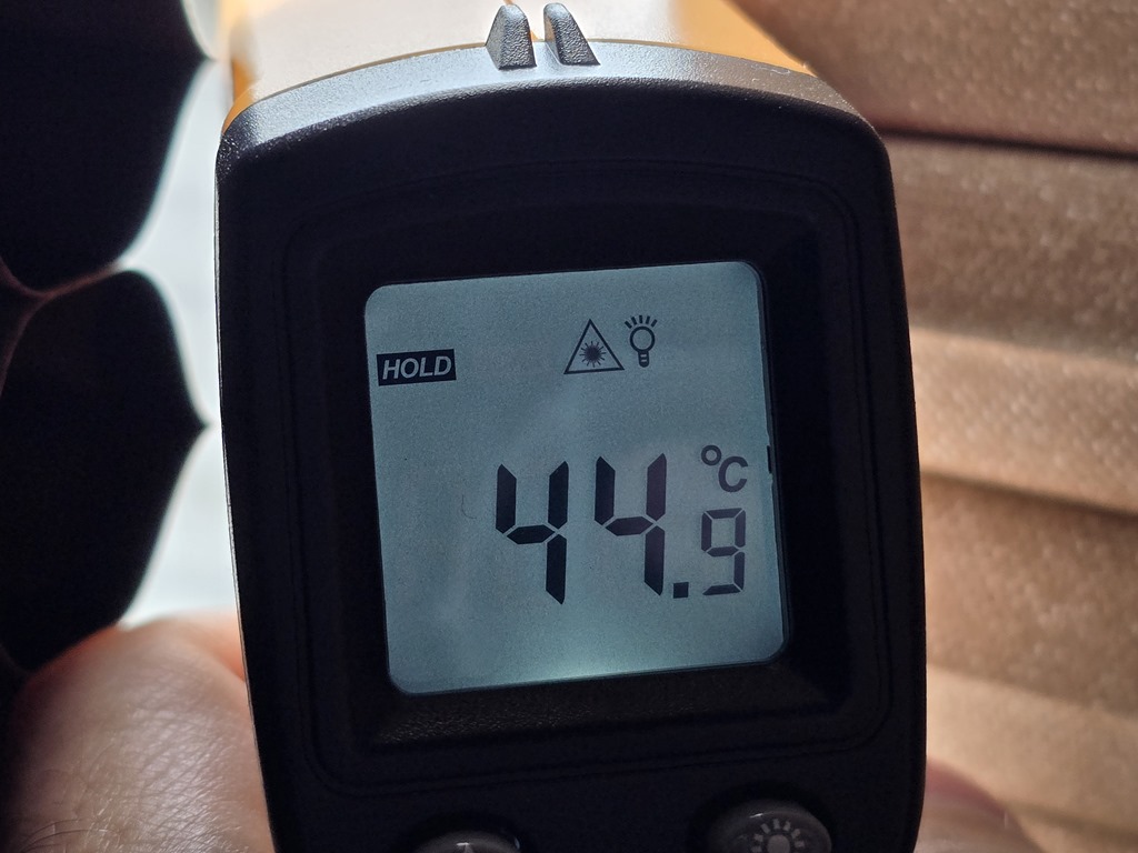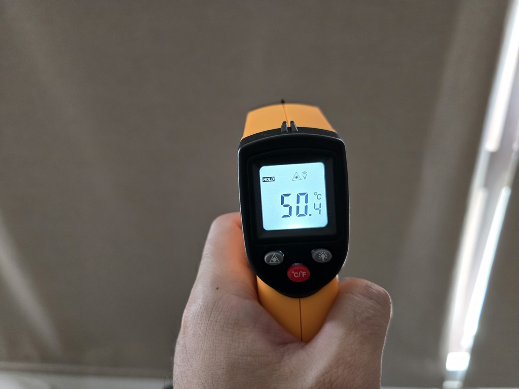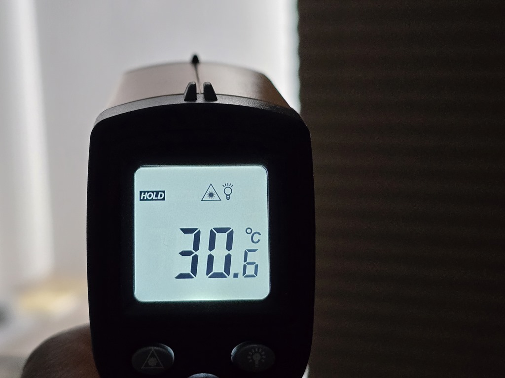到了天氣變熱後,就像一開始所說的,沒想到窗簾居然是燙的,後來直接拿起測溫槍一量,居然高達 50.4 度,幾乎可以舒肥雞肉了。