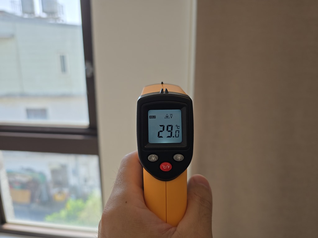 直接測量牆壁有著 30.6 度、窗戶也高達 44.9 度,在這溫度下我絕對會先熱醒。
