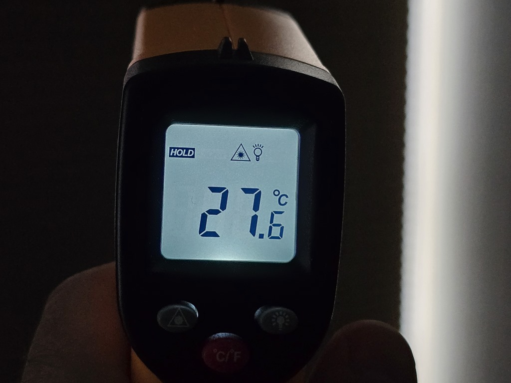 不過一量蜂巢簾居然只有 27.6 度,看來不是體感錯誤,而是窗簾溫度降下來了。這樣不只在春夏之交時,原本要開冷氣變成不用開,在夏天一定要開冷氣的日子裡,也可以更好維持室內涼爽,當然也更省電。