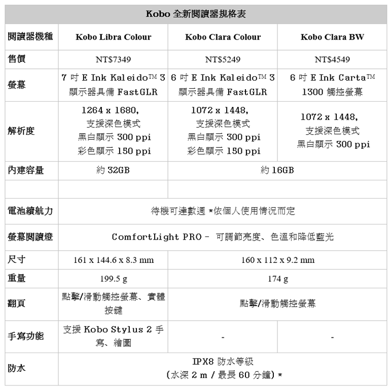 樂天 Kobo 三款新機「Kobo Libra Colour」、「Kobo Clara Colour」、「Kobo Clara BW」即日起在台上市,首波早鳥預購即日起至 4 月 30 日晚上 11:59 止,於樂天市場、PChome24h 購物、誠品門市及誠品線上,均推出獨家優惠,三款新機預購均送 800 元購書金,以及 Kobo Colour 限量貼紙,預購商品將於 4 月 30 日起依序出貨。