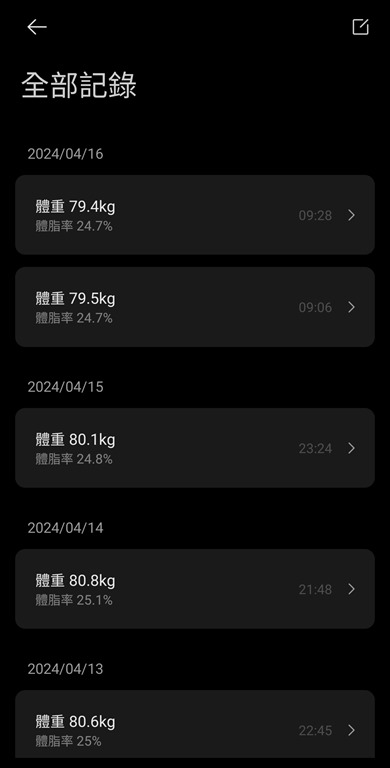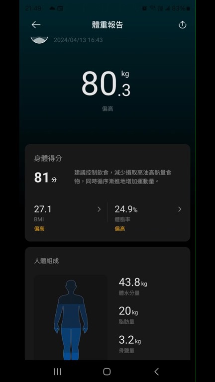 量測完畢後,可以看到體重、BMI、體脂率與身體得分,也會告訴你是不是偏高或標準。