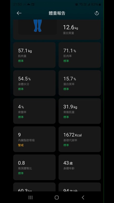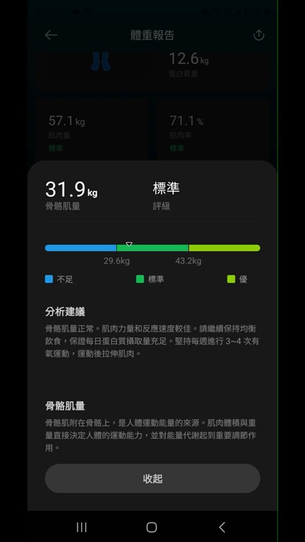 接著還有更多數據,像是身體水分含量、骨鹽量、蛋白質量、肌肉量、內臟脂肪等級、基礎代謝率、心率與身體年齡…等,非常多數據都可以參考。當然也會告訴你那些是超標、哪些是標準,每一項都可以點進去確認一下代表的意義。