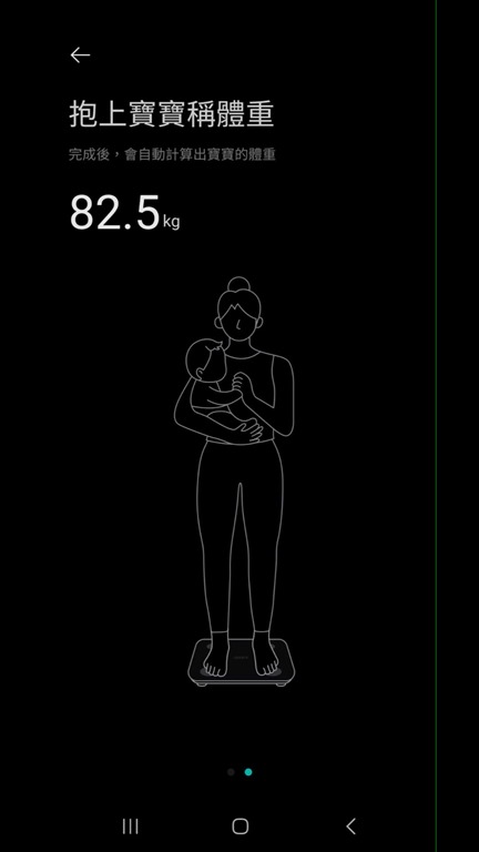 如果要量測嬰兒或是寵物體重,也可以用抱著他們的方式進行,方法也很簡單,就是先站上體脂計後,等穩定就可以抱上要量的嬰兒、寵物或是要量的東西,最後自動相減就是要量測的重量。